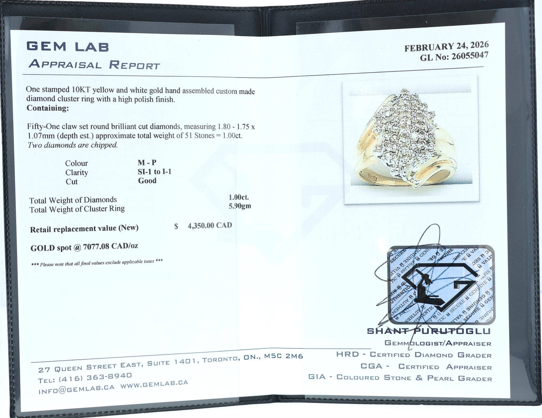 Sparkling blue beauty — big, bold, and exceptionally brilliant. This stunning statement ring features 51 round brilliant cut diamonds forming a large marquise-shaped cluster, delivering incredible fire and sparkle from every angle. The diamonds total approximately 1.00 carat and are set in white gold, beautifully contrasted by a 10 karat yellow gold shank. A true showpiece with outstanding presence. The ring has a gross weight of 5.9 grams and an appraised value of $4,350. Ring Size 6.5. This is a donated item selling with no reserve, no buyer’s premium, and no sales tax — 100% of proceeds to charity.