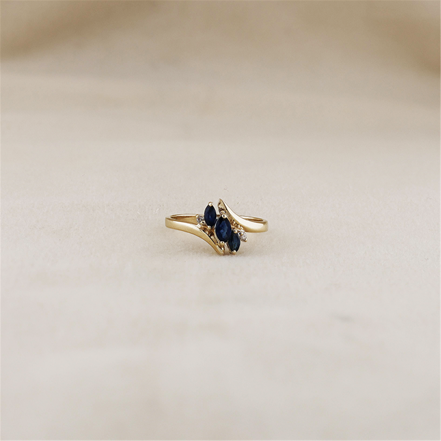 Pretty, delicate, and beautifully dainty. This elegant 10 karat yellow gold ring features a striking design set with three marquise-shaped blue sapphires, gracefully arranged and accented by a small diamond on either side for added sparkle. A refined and feminine look with solid construction despite its light profile. The ring has a gross weight of 1.8 grams and an appraised value of approximately $1,500. Professionally cleaned and polished, ready to be enjoyed. Currently finger size 7 and easily resized to fit most fingers. This is a donated item selling with no reserve, no buyer’s premium, and no sales tax — 100% of proceeds to charity.