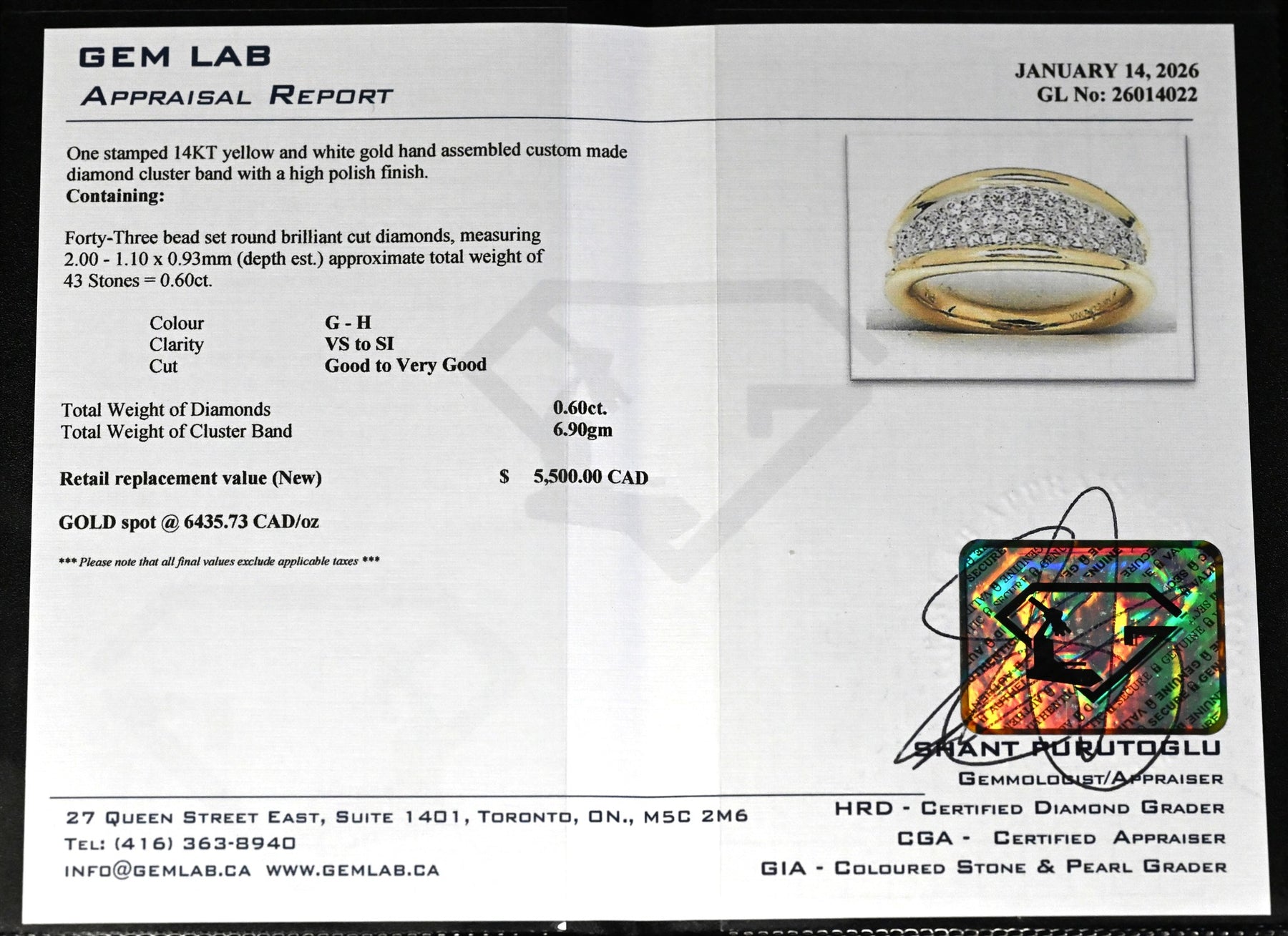 Stunning quality and craftsmanship — 14 karat yellow gold ring featuring 43 round brilliant cut natural diamonds beautifully set into a contrasting white gold top for maximum brilliance and contrast. Total diamond weight is approximately 0.60 carats, showcasing very nice quality stones with exceptional sparkle. This two-tone design blends classic warmth with bright modern brilliance, creating a look of stunning simplicity and refined elegance. Size 6.25. Gross weight of the ring is 6.9 grams. Professionally appraised at $5,500. This is a donated piece being sold as is, no reserve, no sales tax, no buyer’s premium — 100% of the proceeds go directly to the charities.