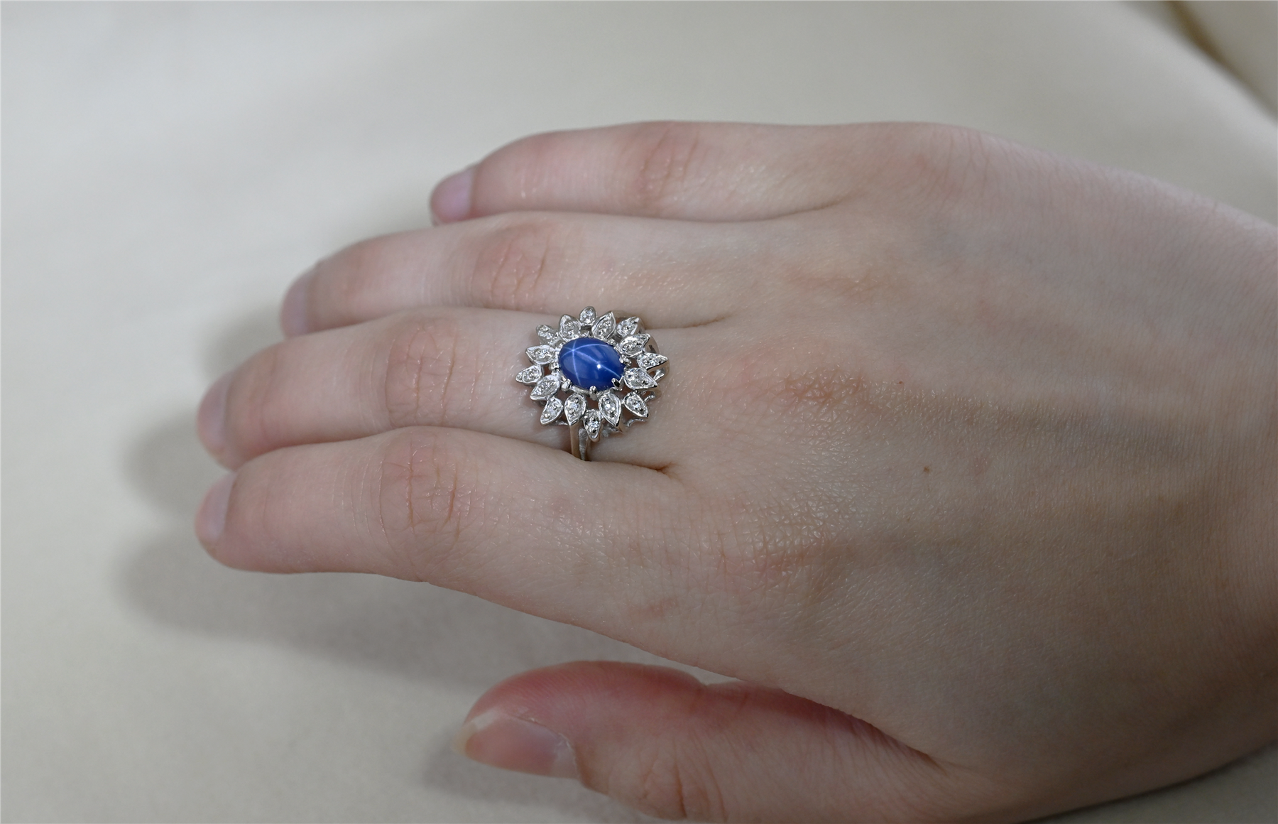 Beautifully made blue star sapphire and diamond ring crafted in solid 14 karat white gold. At the centre sits a synthetic blue star sapphire measuring approximately 8mm x 6mm in an oval cabochon cut, displaying the distinctive star effect across the surface of the stone. Surrounding the centre sapphire is a sparkling snowflake-style cluster of natural diamonds that adds beautiful brilliance and contrast. A heavy, well-constructed ring with excellent presence and quality craftsmanship throughout. Currently finger size 7 and easily resized to fit most fingers. Gross weight (14 karat gold ring): 5.1 grams. Estimated appraised value: $3,000. This is a donated item selling with no reserve, no buyer’s premium, no sales tax — 100% of proceeds go to the charities.