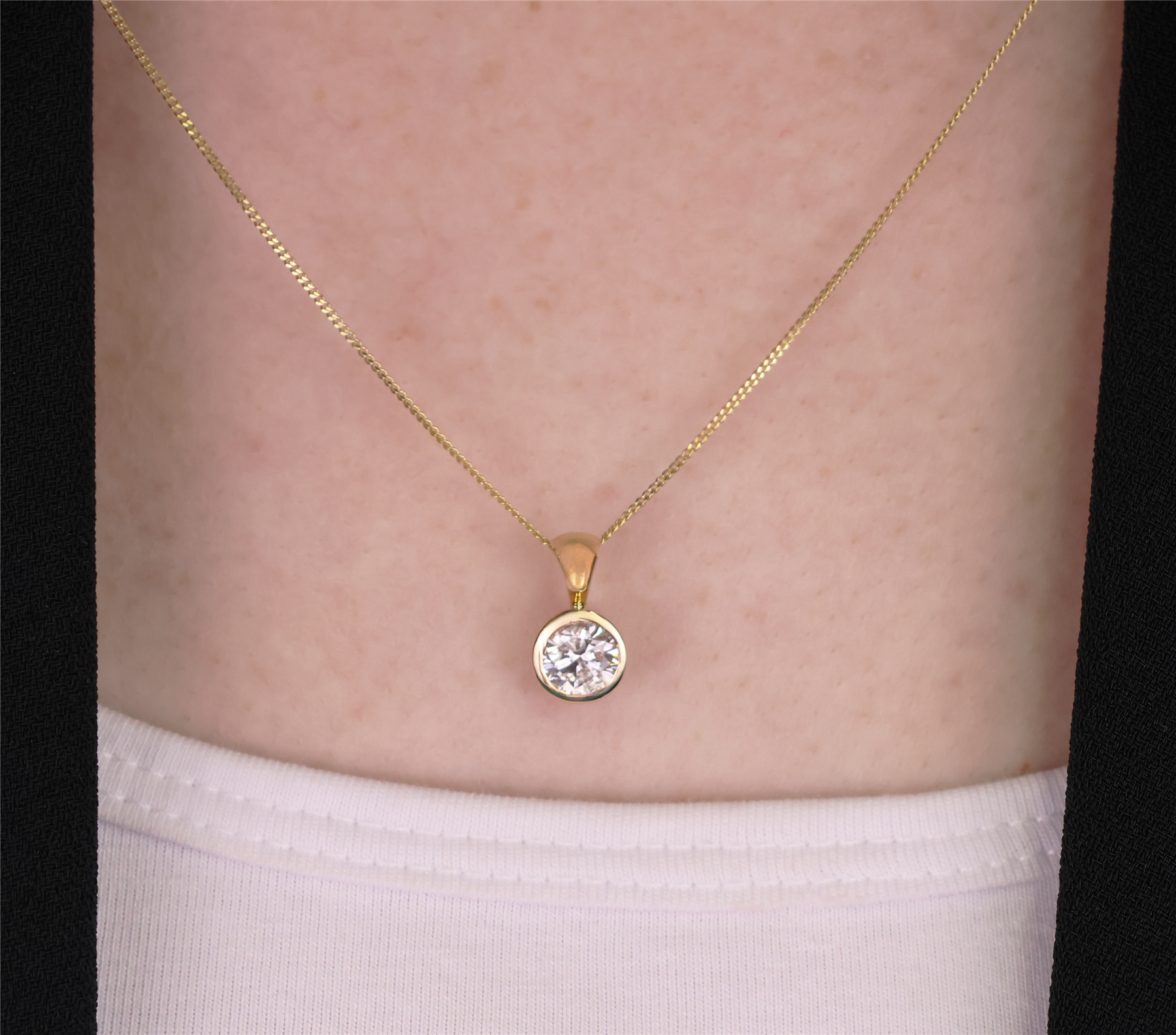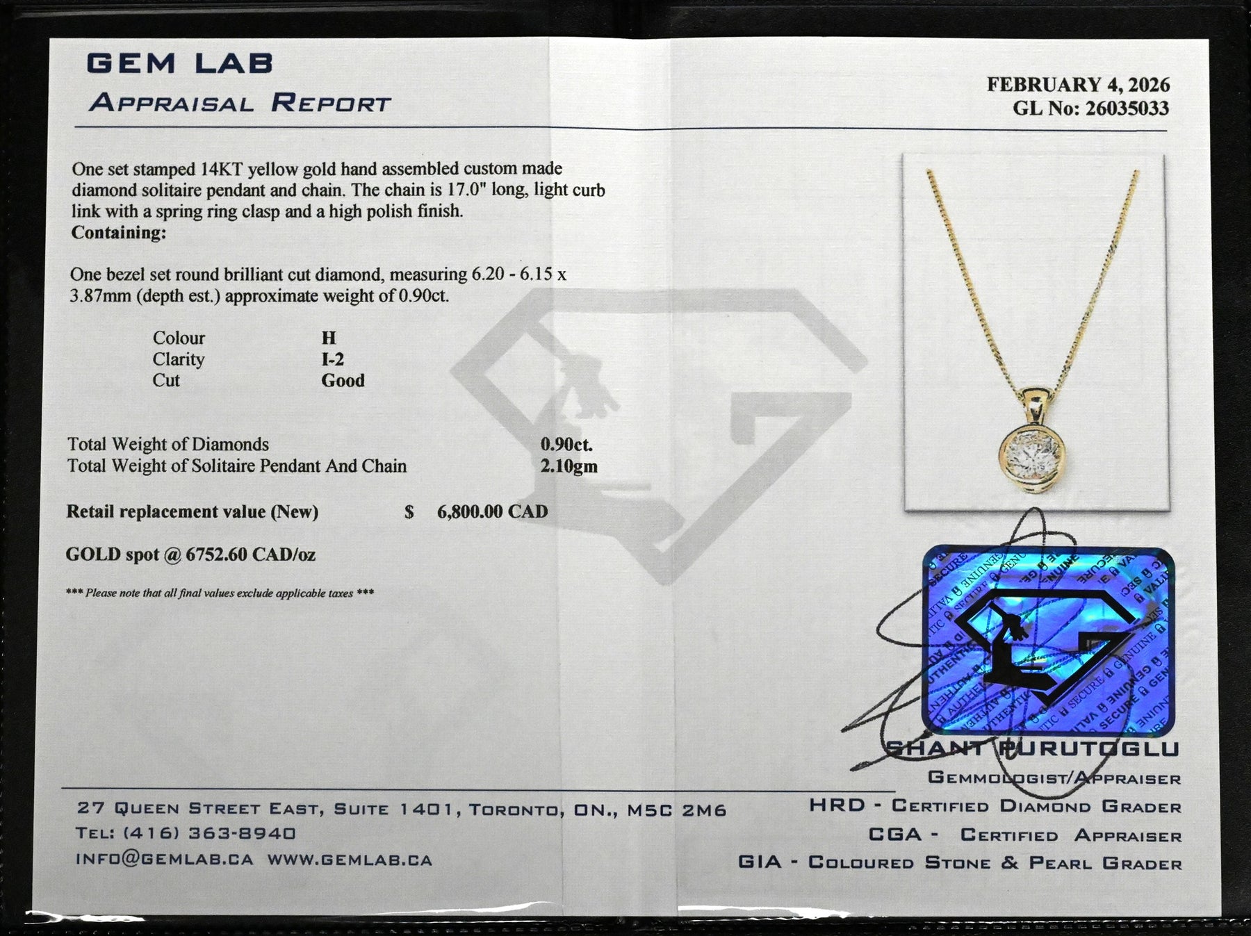 Classic elegance with serious presence — 14 karat yellow gold solitaire diamond pendant bezel set with one stunning round brilliant cut diamond weighing approximately 0.90 carats, just shy of a full carat. This is the kind of piece that never goes out of style — clean, confident and endlessly wearable. The rich yellow gold bezel frames the diamond beautifully while allowing maximum brilliance and fire, creating a timeless look that works effortlessly from day to evening. Suspended from a 14 karat yellow gold 17-inch curb chain, the combined gross weight is 2.1 grams. Professionally appraised at $6,800. A powerful yet refined statement of classic luxury. See the link below for appraisal and more detailed photographs. This is a donated piece being sold as is, no reserve, no sales tax, no buyer’s premium — 100% of the proceeds go directly to the charities.