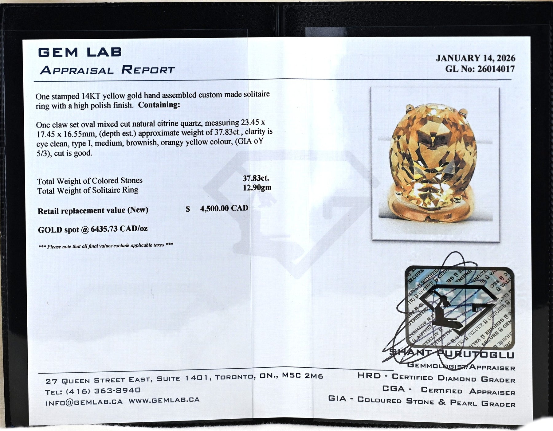 Make a statement — massive natural citrine quartz gemstone weighing an impressive 37.83 carats, measuring approximately 23 mm x 17 mm and showcasing a rich brownish-orangey yellow colour with outstanding brilliance and sparkle. This extraordinary stone is set in a substantial custom-made 14 karat gold solitaire mounting with bold presence and confident styling. With a heavy overall gross weight of 12.90 grams, this ring is designed to stand out and command attention. Size 6.25. Professionally appraised at $4,500. Absolutely stunning and unquestionably a bold statement piece. This is a donated piece being sold as is, no reserve, no sales tax, no buyer’s premium — 100% of the proceeds go directly to the charities.