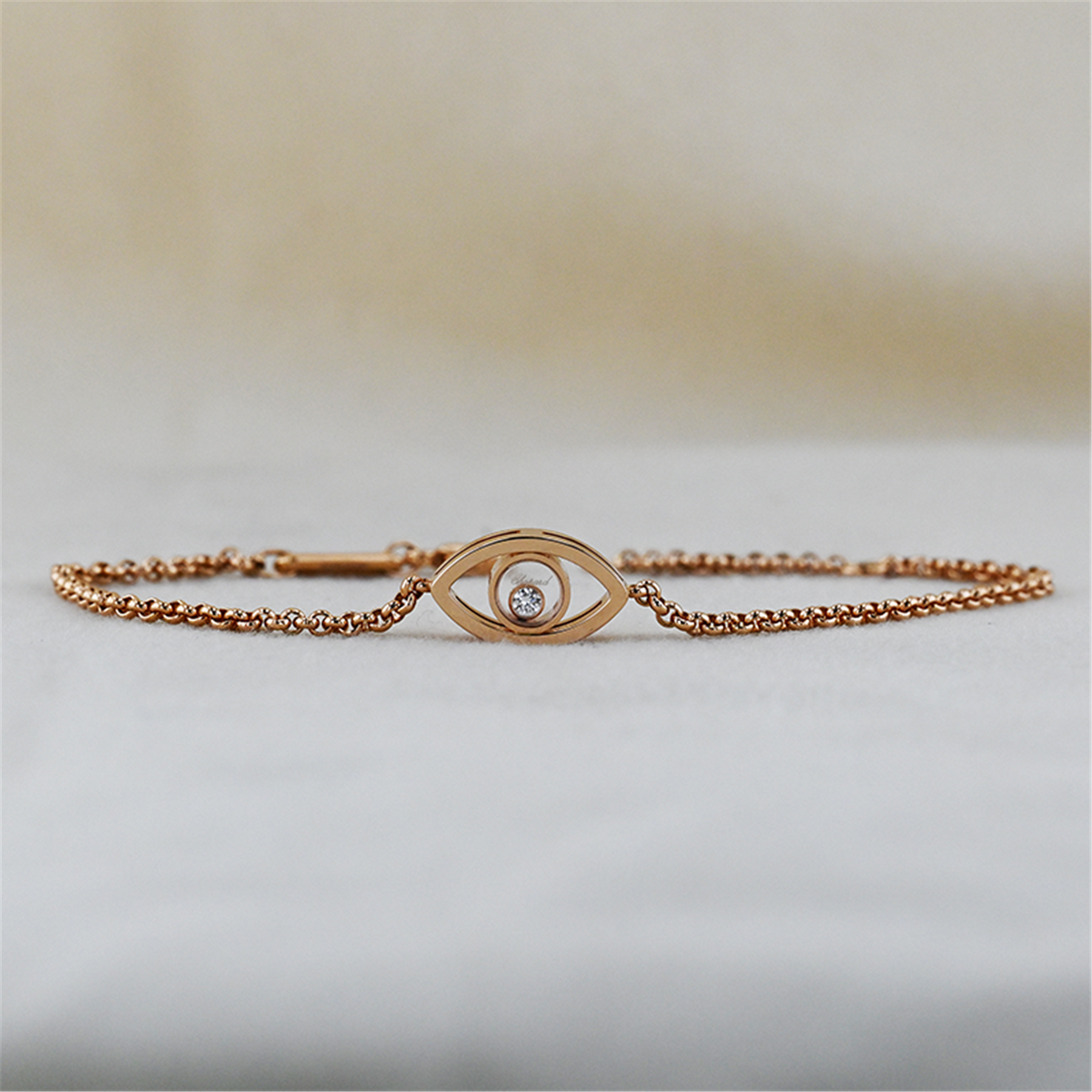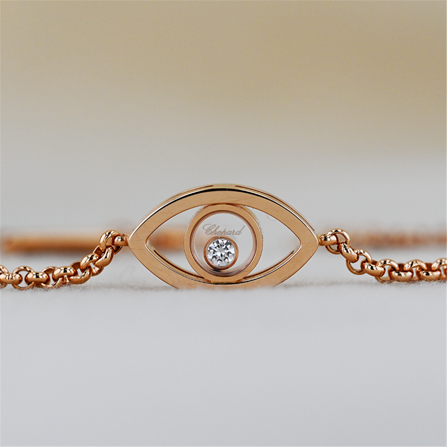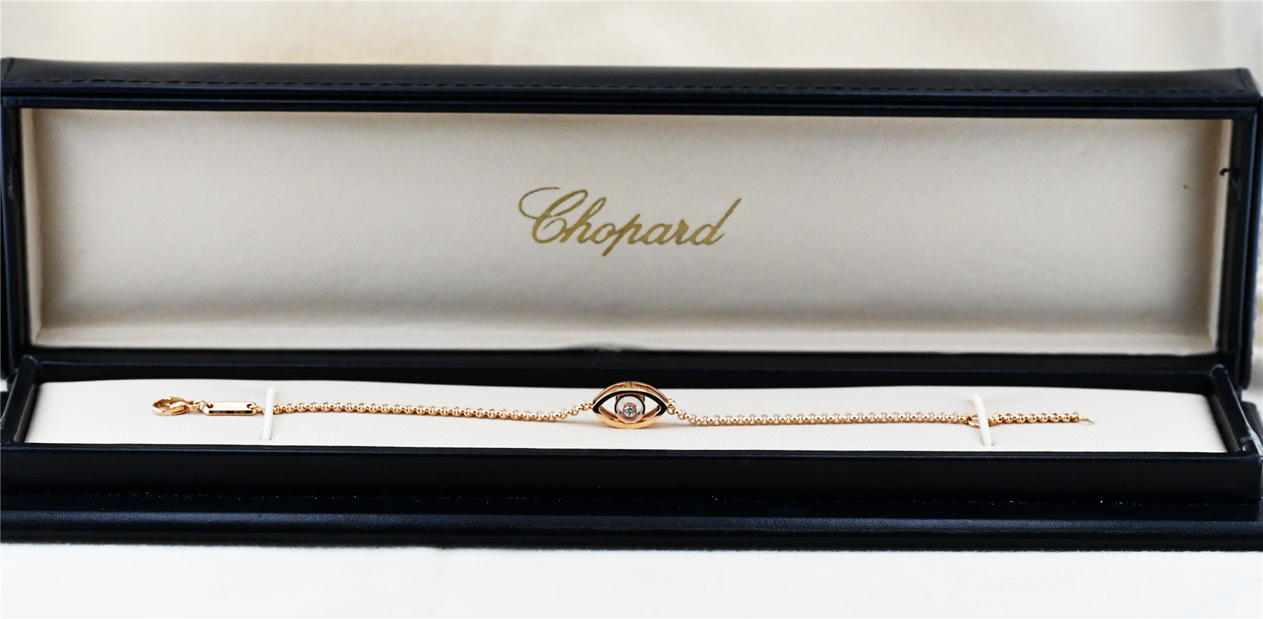 Authentic Chopard “Happy Diamonds Eye” bracelet crafted in 18 karat rose gold, a beautifully designed luxury jewellery piece from the renowned Swiss house Chopard. This elegant bracelet features Chopard’s distinctive eye-shaped motif with a floating brilliant cut diamond suspended within the centre, allowing the diamond to move freely and sparkle with every movement, a signature design element of the famous Happy Diamonds collection. The bracelet is constructed as a heavy solid rolo link chain and is fully signed Chopard, reflecting the exceptional craftsmanship and refined design the brand is known for. The bracelet measures 7½ inches in length and includes an added adjustment link allowing it to also be worn at approximately 6¾ inches, offering versatile sizing. The piece comes complete with its original Chopard presentation box and show card, making it an especially desirable complete set.