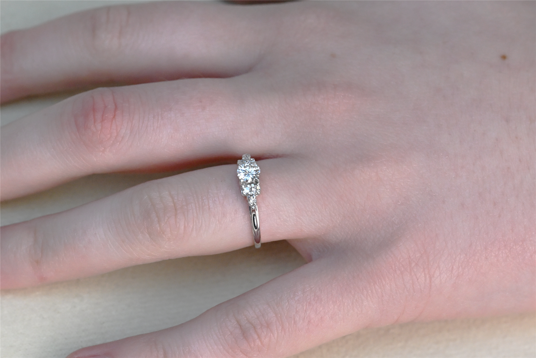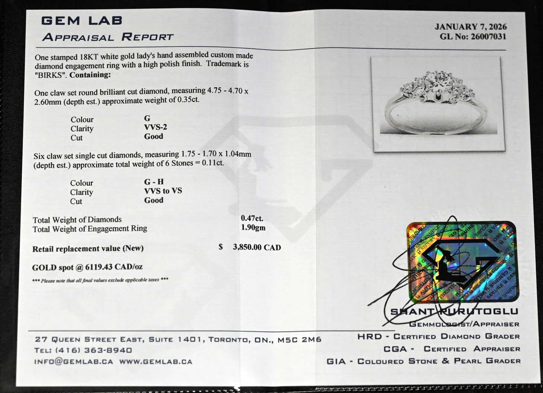 18 karat white gold — a beautiful classic vintage diamond engagement ring crafted by Birks, a name synonymous with quality. The centre features a high-quality round brilliant cut diamond graded VVS2 clarity and G colour, weighing about 0.35 carats. It is flanked by six smaller round single cut diamonds of VS clarity, bringing the total diamond weight to approximately 0.47 carats. Elegant, refined and timeless in design, this is a stunning example of classic craftsmanship and enduring style. Professionally appraised at $3,850. Size 6.25. This is a donated piece being sold as is, no reserve, no sales tax, no buyer’s premium — 100% of the proceeds go directly to the charities.