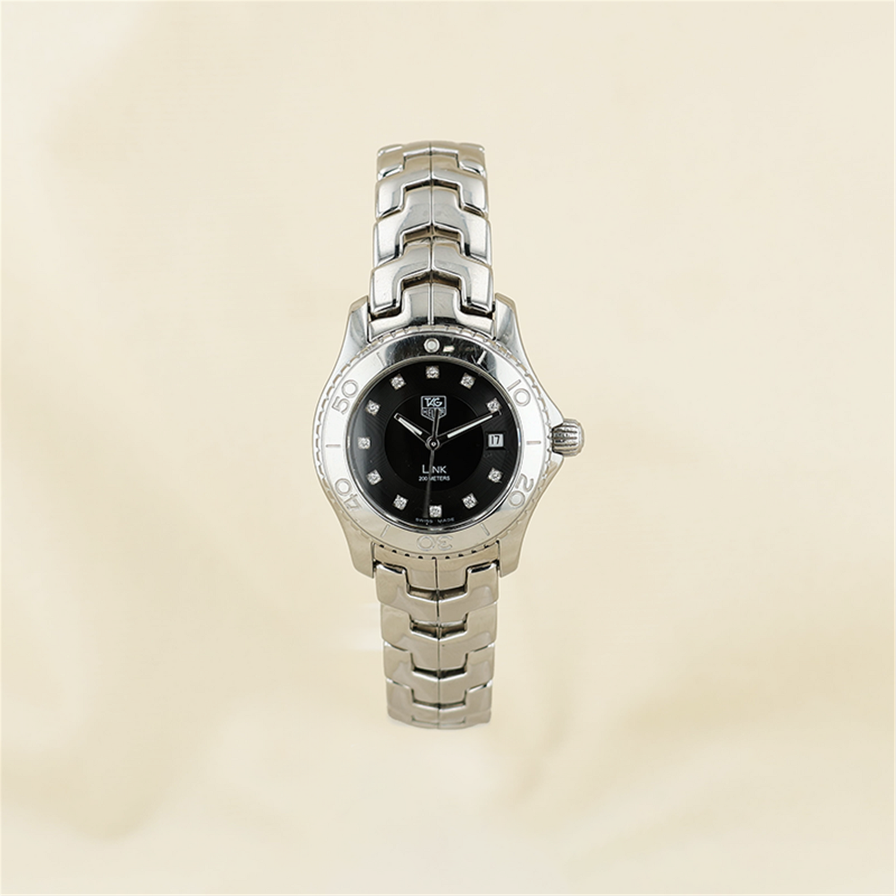 Ladies TAG Heuer Link wristwatch, reference WJ1318, featuring a striking black dial set with sparkling diamond hour markers and the iconic stainless steel Link bracelet with its distinctive flowing design. This elegant Swiss quartz timepiece is presented in very nice clean original condition with minimal wear. A fresh battery has just been installed and the watch was running and keeping time at the time of listing. A stylish and recognizable luxury watch from the renowned TAG Heuer Link collection, perfect for everyday wear or evening occasions. This is a donated piece being sold as is, no reserve, no sales tax, no buyer’s premium — 100% of the proceeds go directly to the charities.