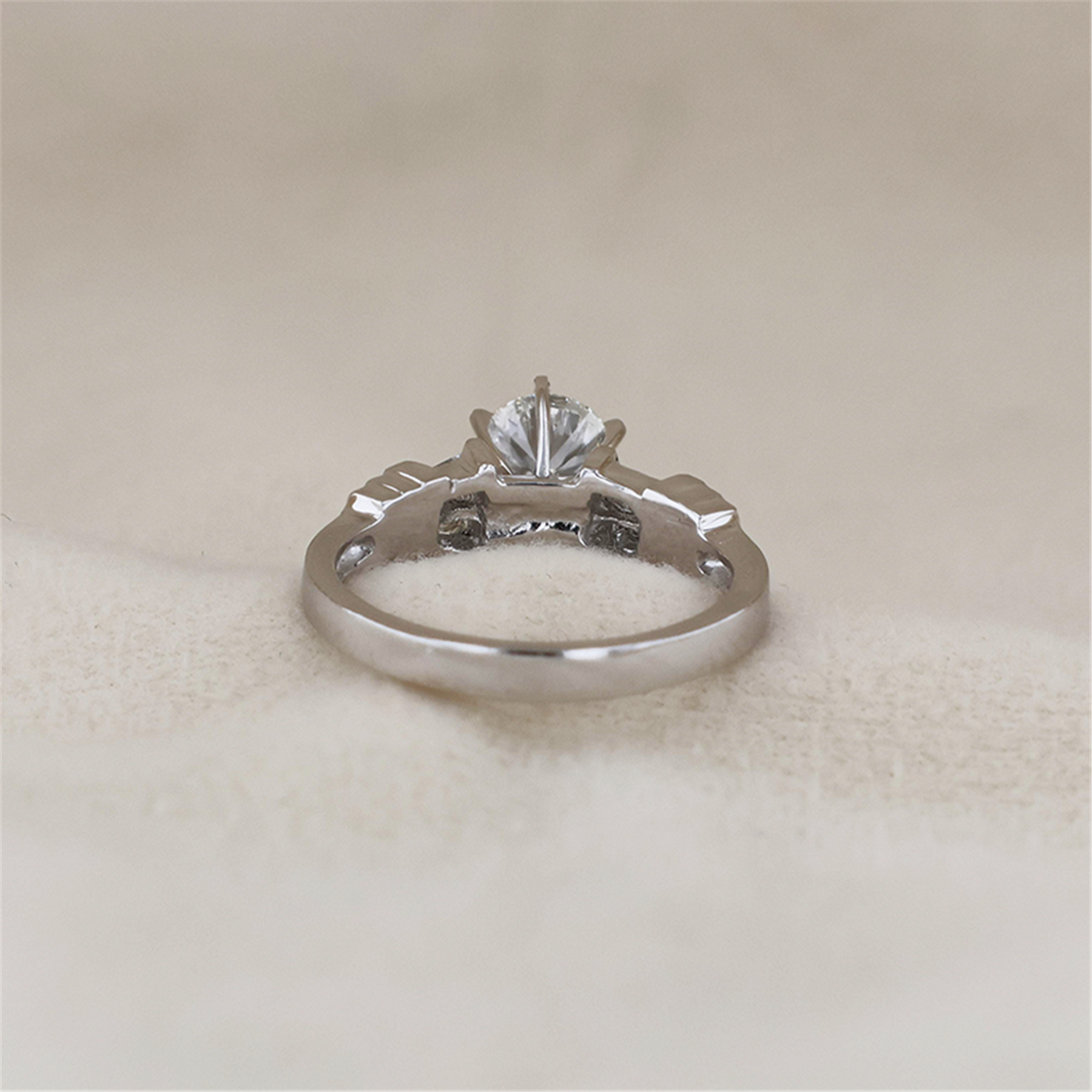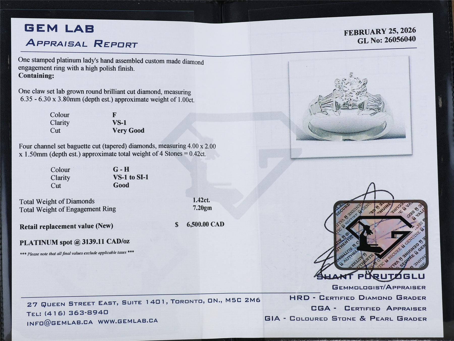 Platinum engagement ring — stunningly classic and in beautiful, like-new condition. This heavy, solid platinum ring is exceptionally well constructed with timeless design throughout. Each shoulder is set with two high-quality tapered baguette natural diamonds, adding refined elegance and balance. The centrepiece is a high-quality round brilliant cut lab grown diamond secured in a classic platinum six-claw setting, delivering outstanding brilliance and presence. A substantial, beautifully built ring designed to last a lifetime. Currently finger size 6.75 and easily resized to fit most. This impressive platinum ring weighs 7.20 grams and carries an appraised value of $6,500. Professionally cleaned and polished, ready to be enjoyed. This is a donated item selling with no reserve, no buyer’s premium, and no sales tax — 100% of proceeds to charity.