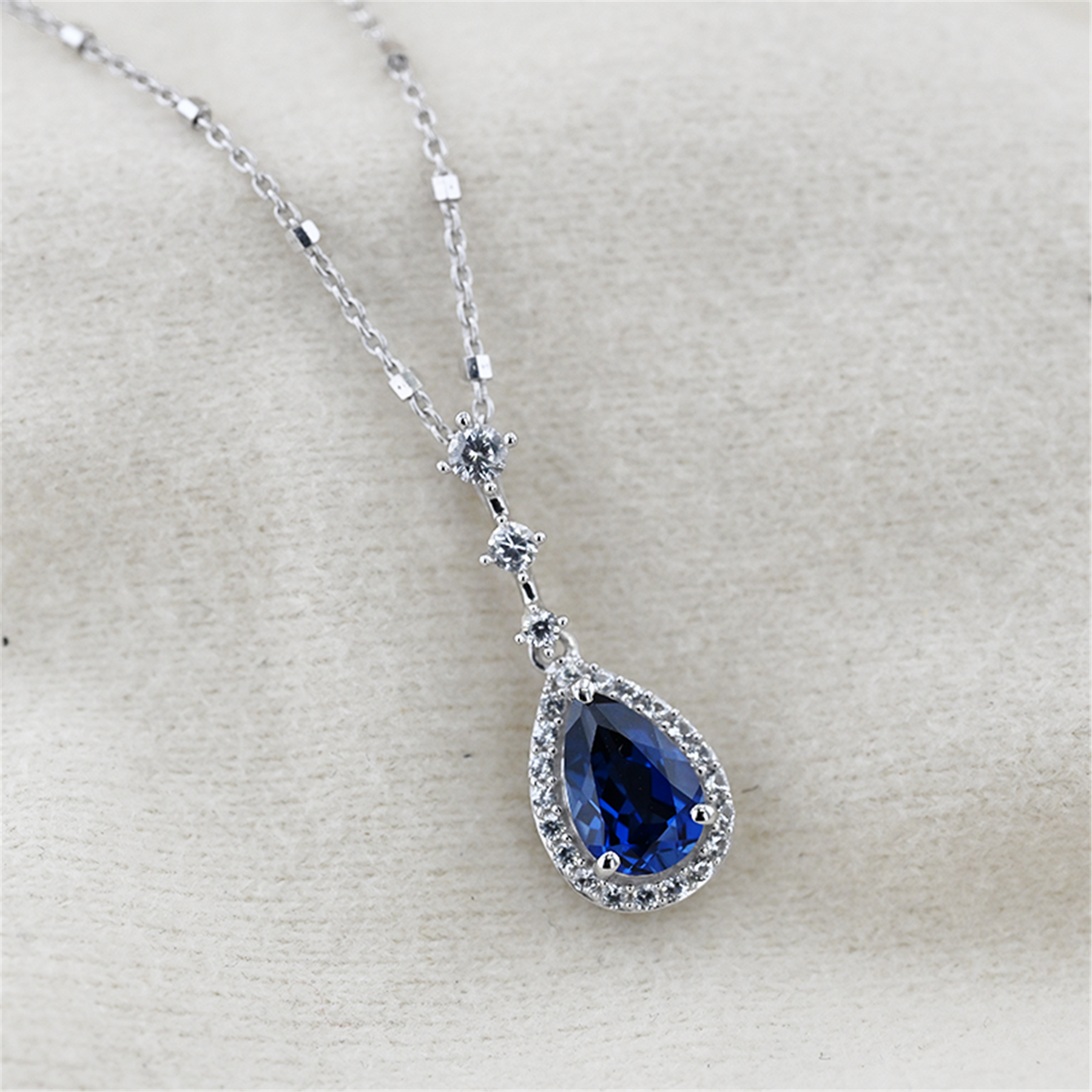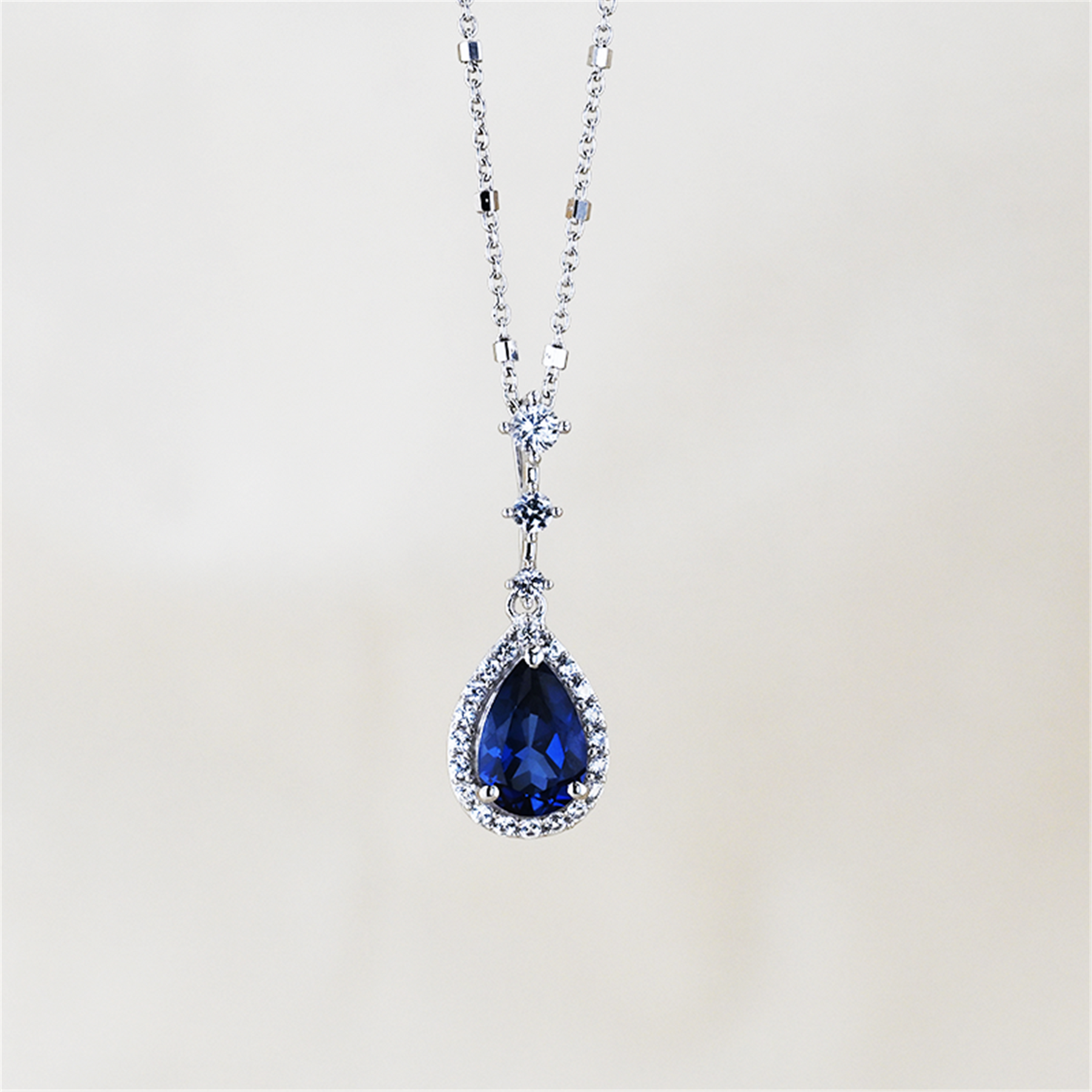 Lovely fashion statement piece — affordable quality and beautifully made. This elegant 10 karat white gold halo pendant features a rich deep blue synthetic sapphire measuring approximately 10mm x 6mm, surrounded by sparkling white sapphires that form a brilliant halo around the centre stone. The pendant is finished with a graceful drop bail set with three additional white sapphires, adding extra sparkle and elegance. Suspended from a gorgeous 10 karat white gold chain accented with small diamond-cut elements throughout, this piece offers beautiful movement and shine. A refined and stylish piece of jewellery — if you need something blue, this is gorgeous. Gross weight (10 karat gold pendant and chain): 3.6 grams. Estimated appraised value: $900. This is a donated item selling with no reserve, no buyer’s premium, no sales tax — 100% of proceeds go to the charities.