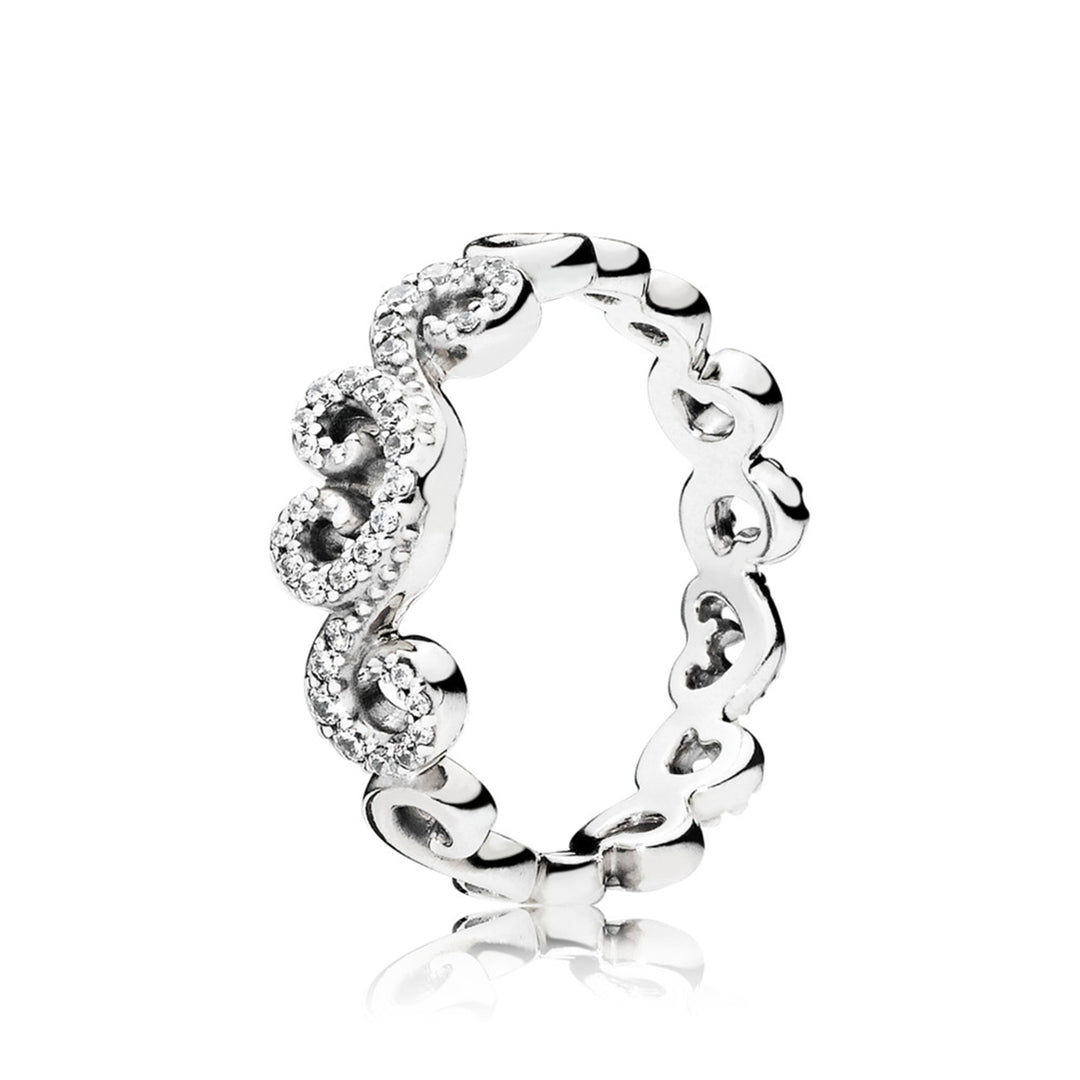 Chandelier ring in sterling silver with 4 bezel-set, 14 bead-set clear CZ and 1 flush-set heart-shaped clear CZ