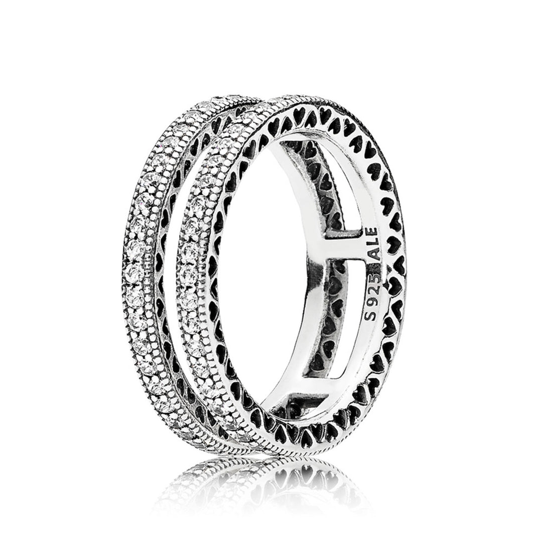 Double ring in sterling silver with clear CZ and cut-out hearts