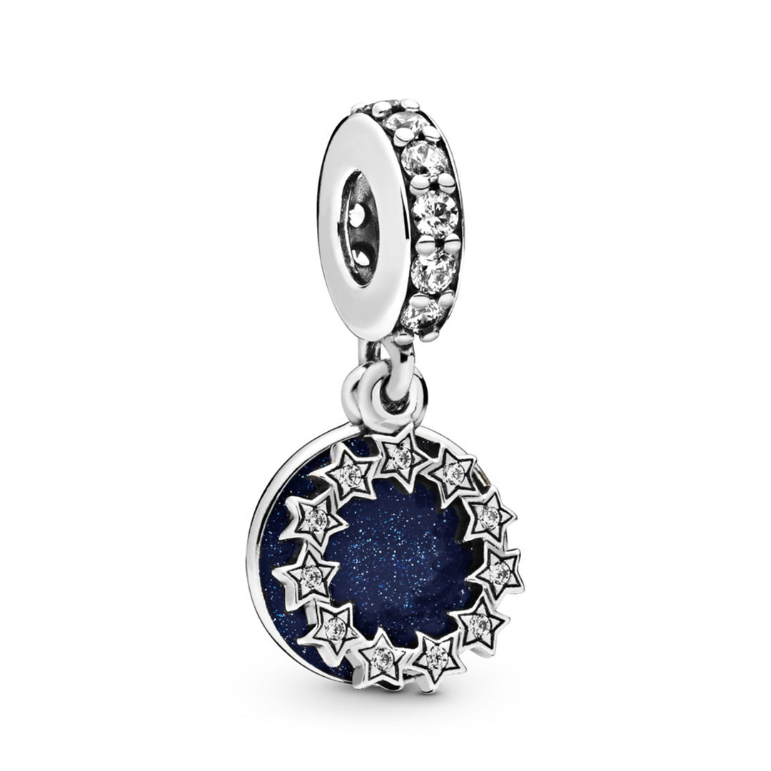 Sterling silver dangle with clear cubic zirconia and shimmering blue enamel
