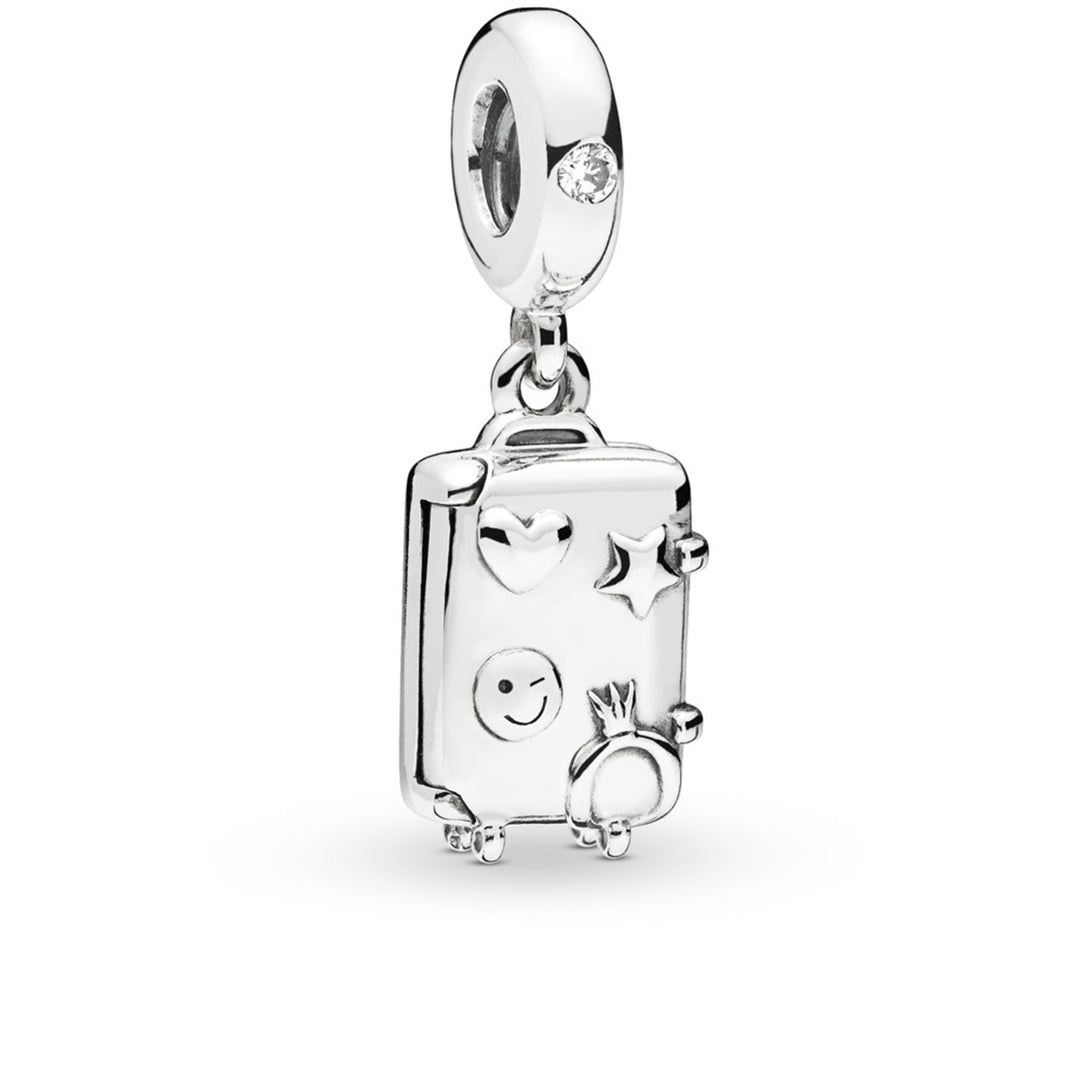 Suitcase dangle in sterling silver with transparent pale pink enamel, 1 flush-set clear CZ and engraving "Ready to explore"