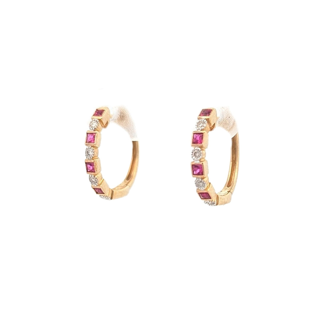 10KT Yellow Gold Ruby and 0.066ctw Diamond Hoop Earrings
