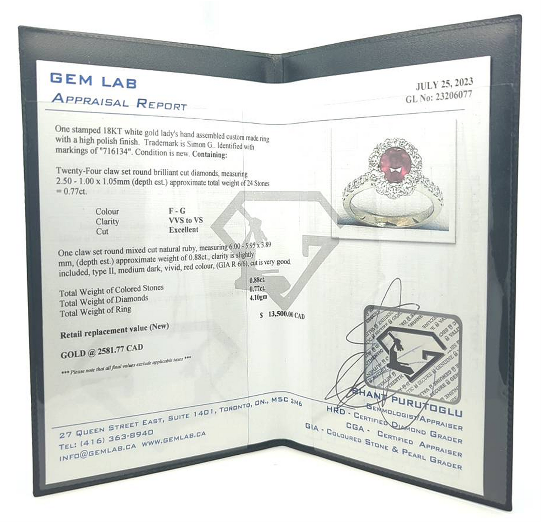 Retail Replacement Value (New) $13,500.00 CAD