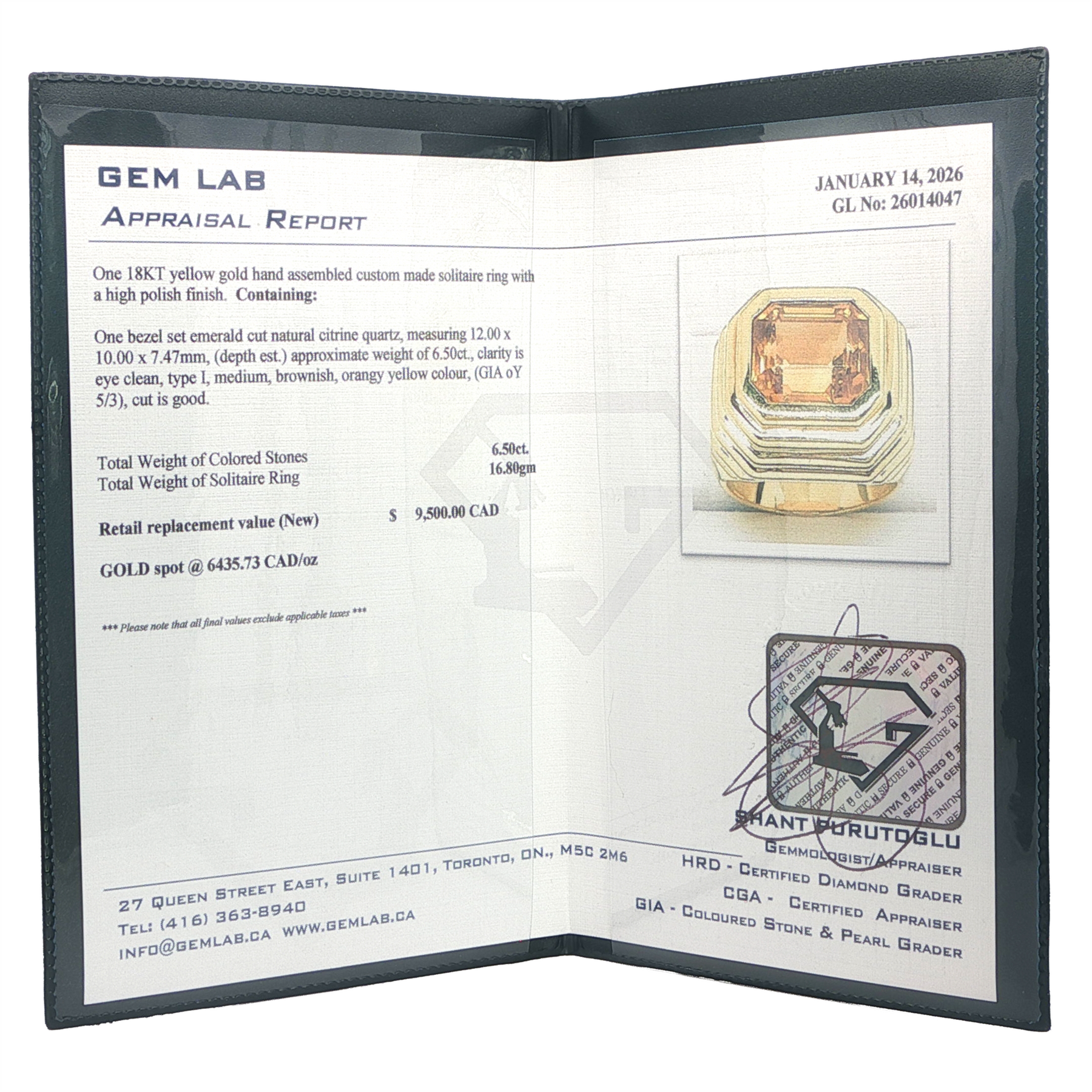 One bezel set emerald cut natural citrine quartz, measuring 12.00 x 10.00 x 7.47mm, (depth est.) approximate weight of 6.50ct., clarity is eye clean, type I, medium, brownish, orangy yellow colour, (GIA oY 5/3), cut is good.