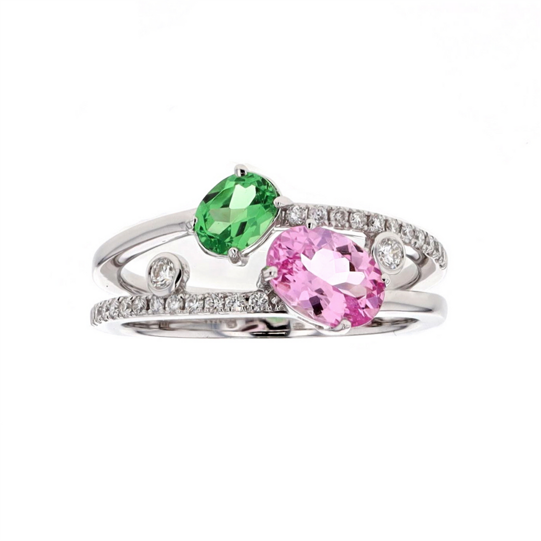 Simon G - 18KT White Gold Pink Spinel, Tsavorite, and 0.21ctw Diamond Ring