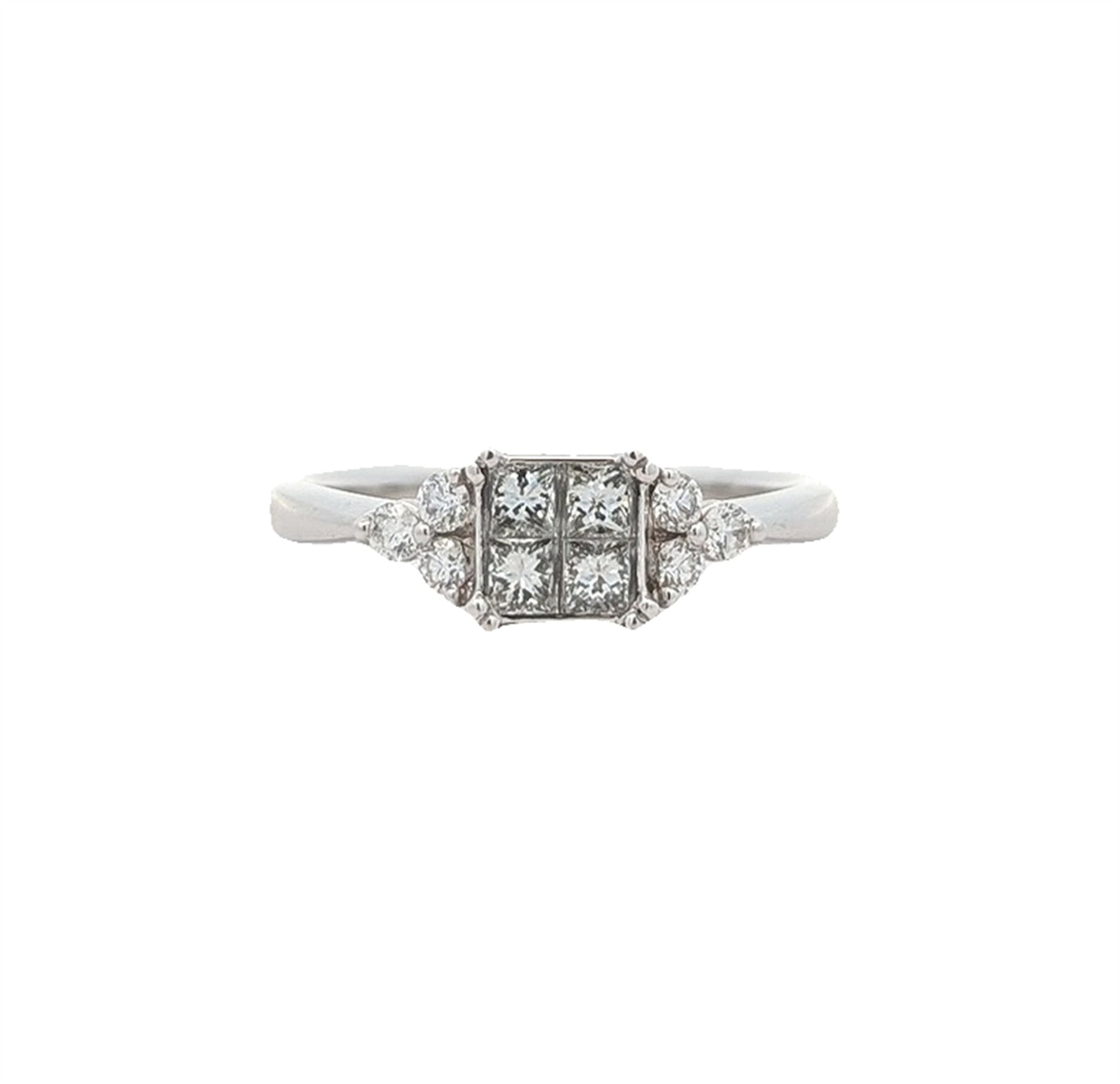 Four invisible set princess cut diamonds, measuring 2.50 x 2.40 x 1.80mm (depth est.) approximate total weight of 4 Stones = 0.35ct.