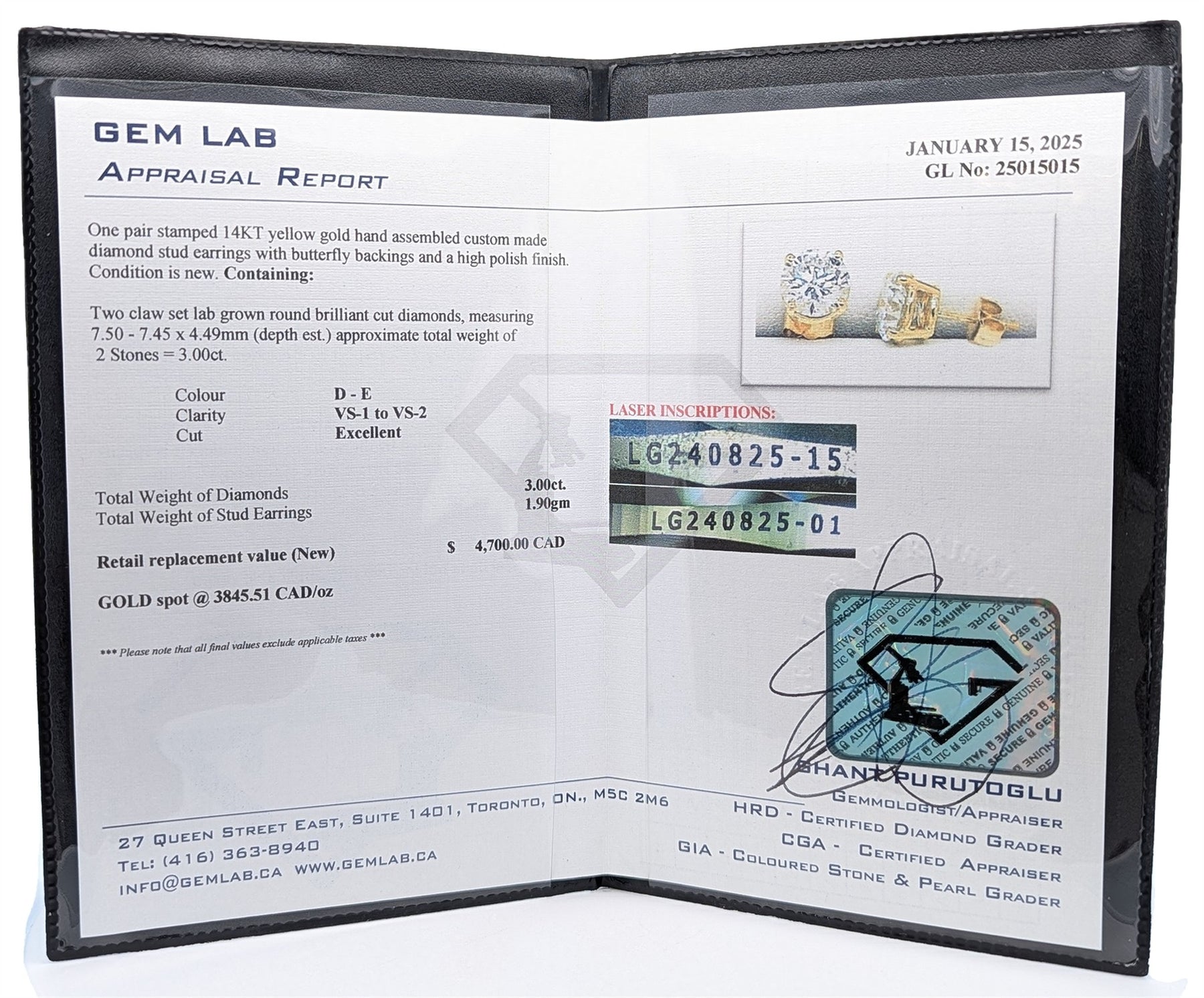 14KT Yellow Gold 3.00ctw Lab Grown Diamond Stud Earrings