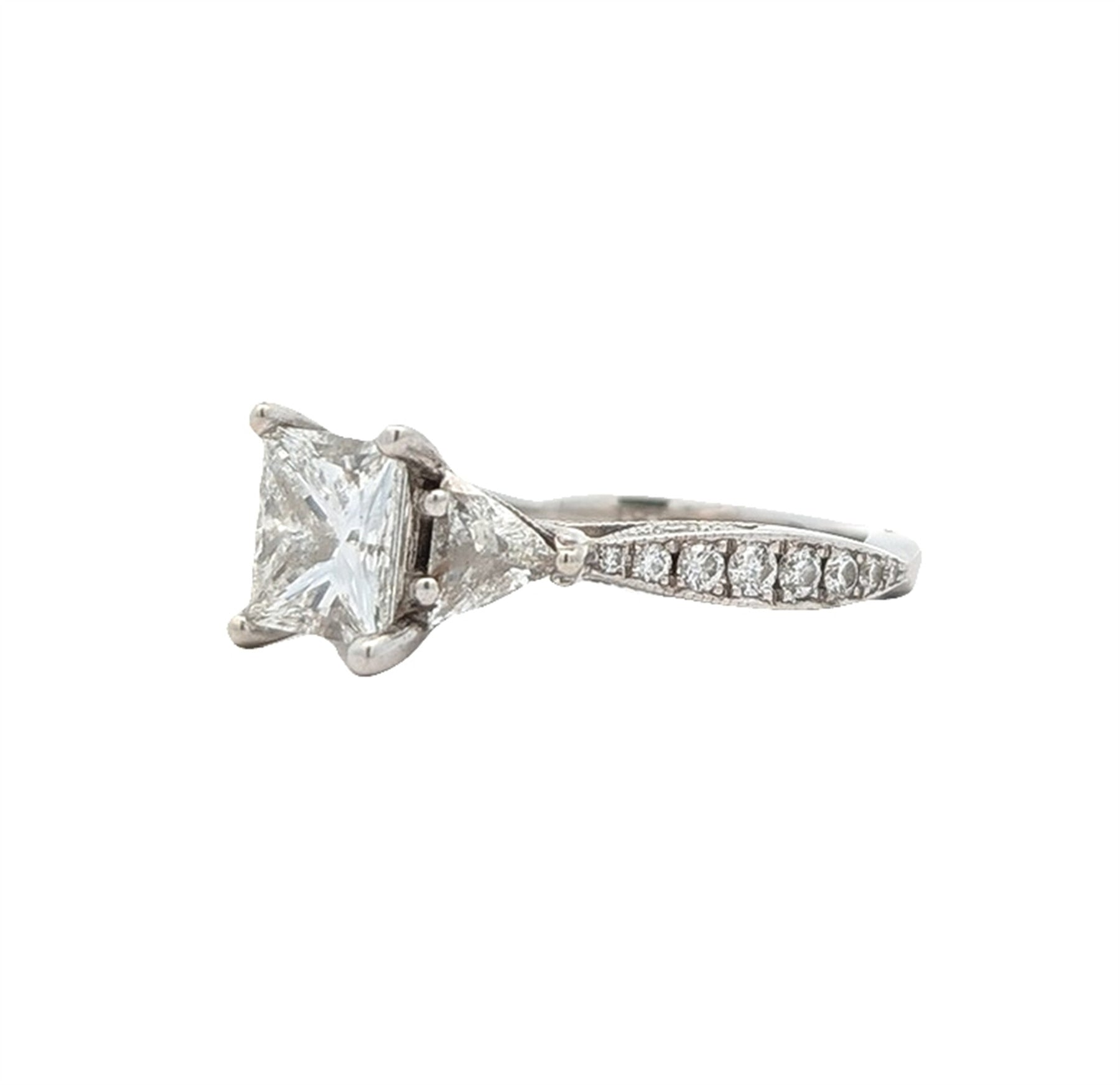 One claw set princess cut diamond, measuring 6.46 x 6.43 x 4.50mm (depth est.) approximate weight of 1.53ct.