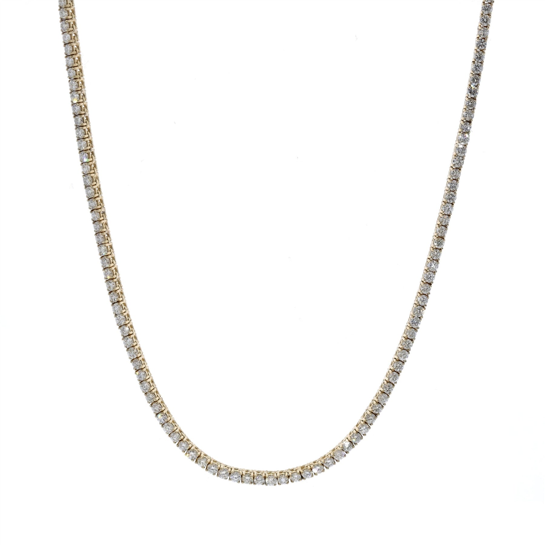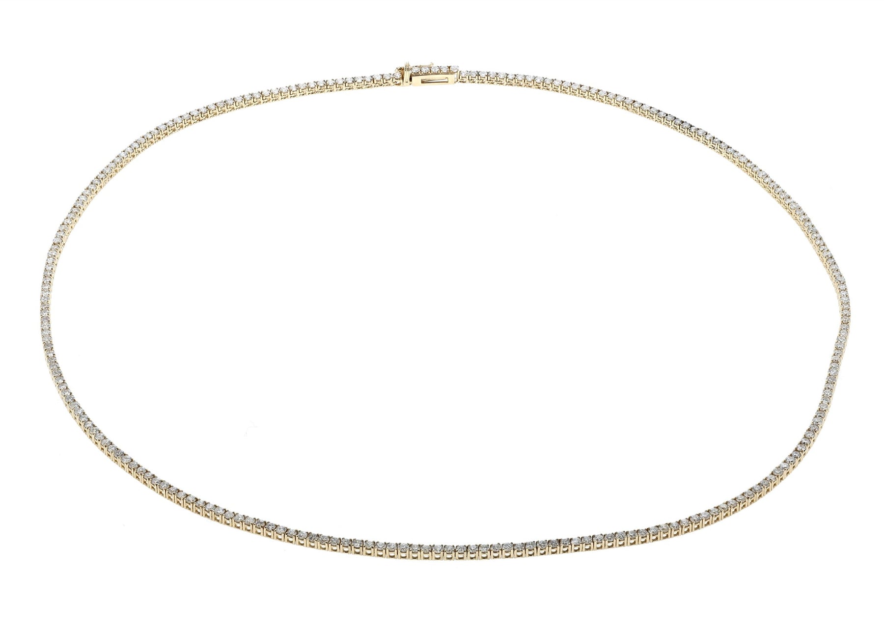 One 14KT yellow gold lady's hand assembled custom made diamond 17" tennis necklace with a custom box clasp and a safety eight clasp with a high polish finish.