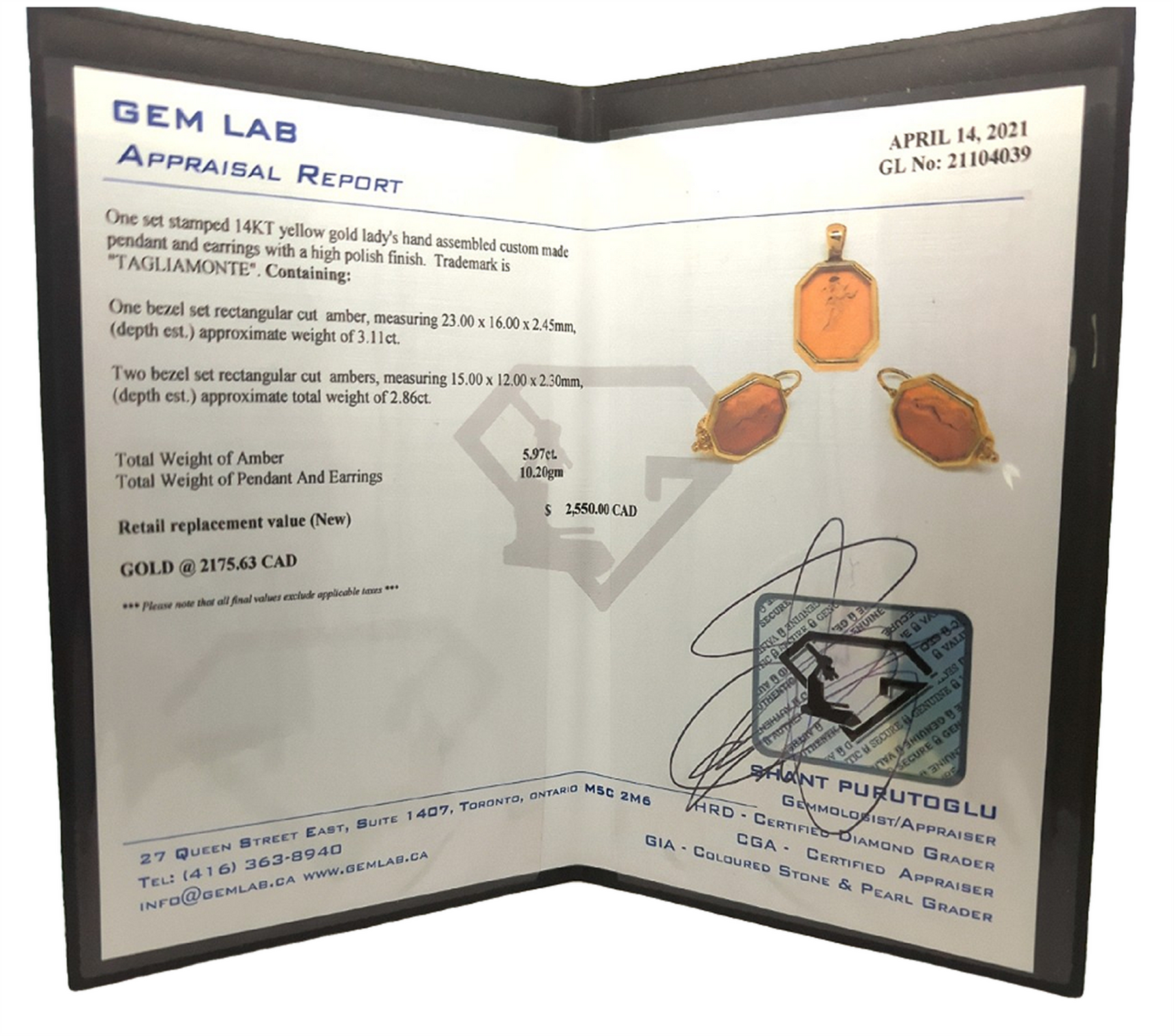 One set stamped 14KT yellow gold lady's hand assembled custom made pendant and earrings with a high polish finish. Trademark is "TAGLIAMONTE".