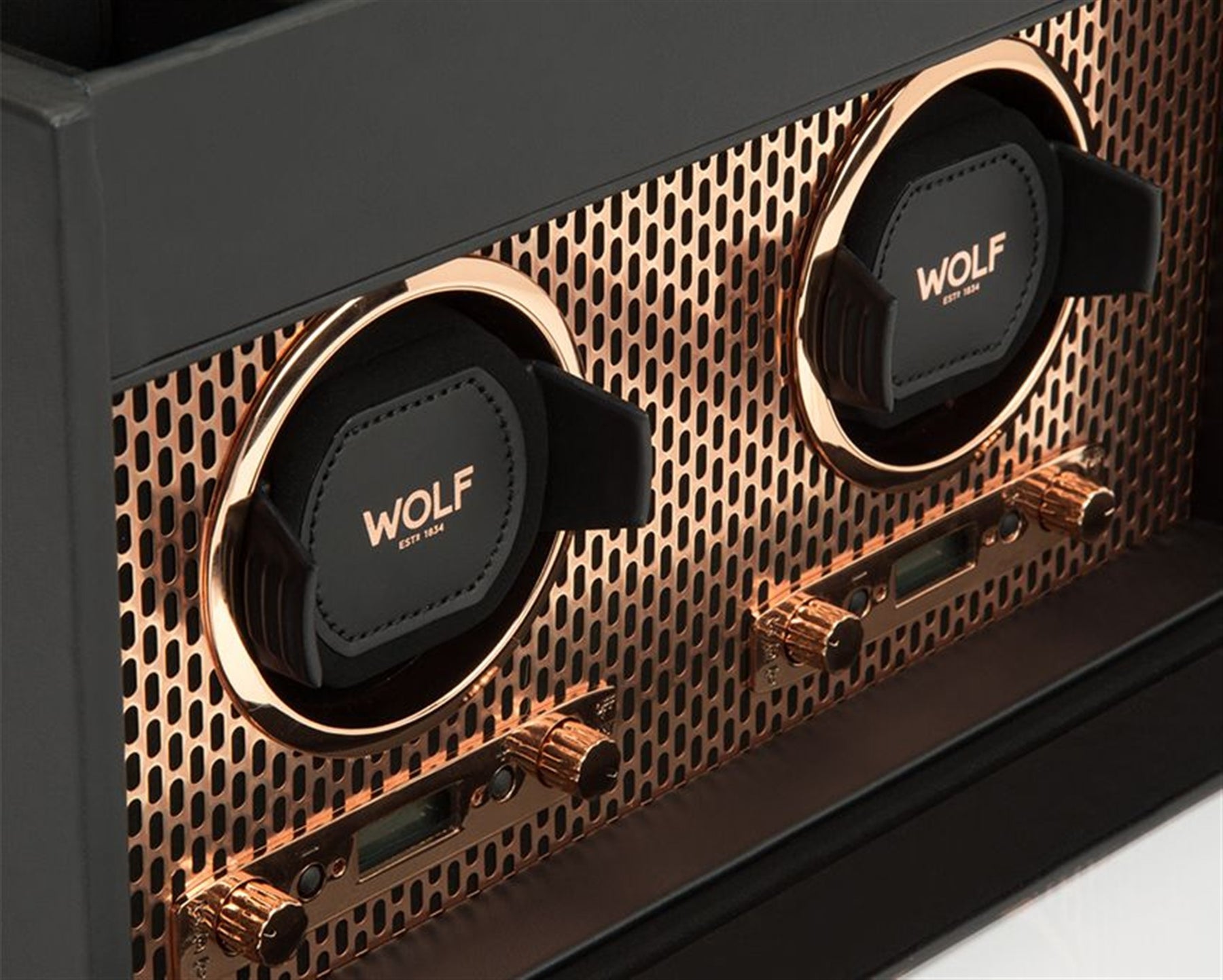 Powder-coated and copper plated laser cut perforated steel melded with clean, sleek lines. AXIS drives a modern, bold look for safekeeping your timepieces. Our patented technology of counting rotations of the axis of your watch guarantees precise turns per day. Bold luxury, faultless design, take AXIS for a spin.