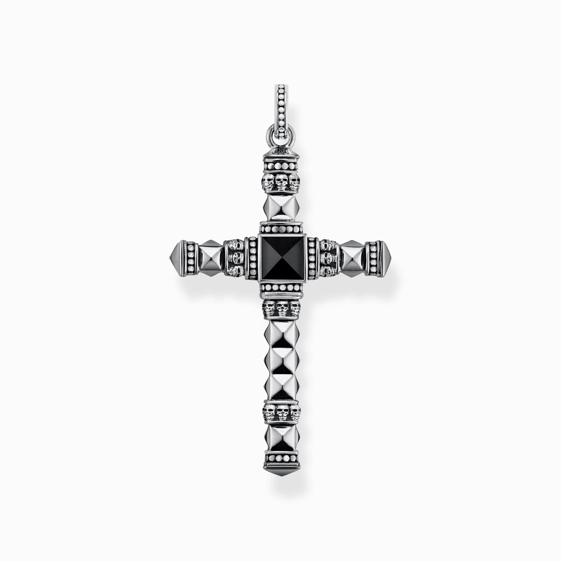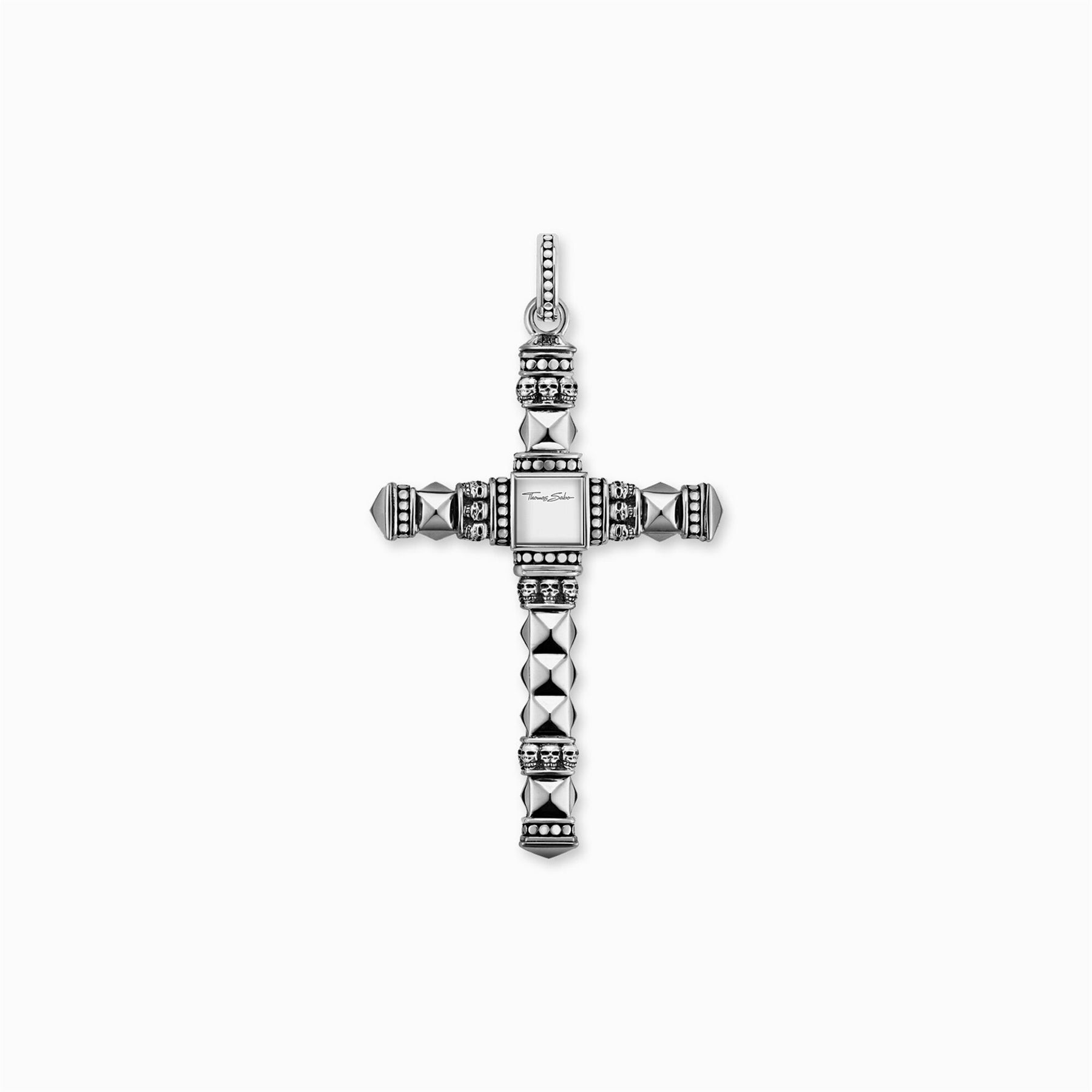 Expressive interpretation: Expressive studs and small skulls adorn the cross pendant in abstract style and give it an attractive feel. The hand-cut centre stone in a pyramid cut is the eye-catcher of the jewellery item.