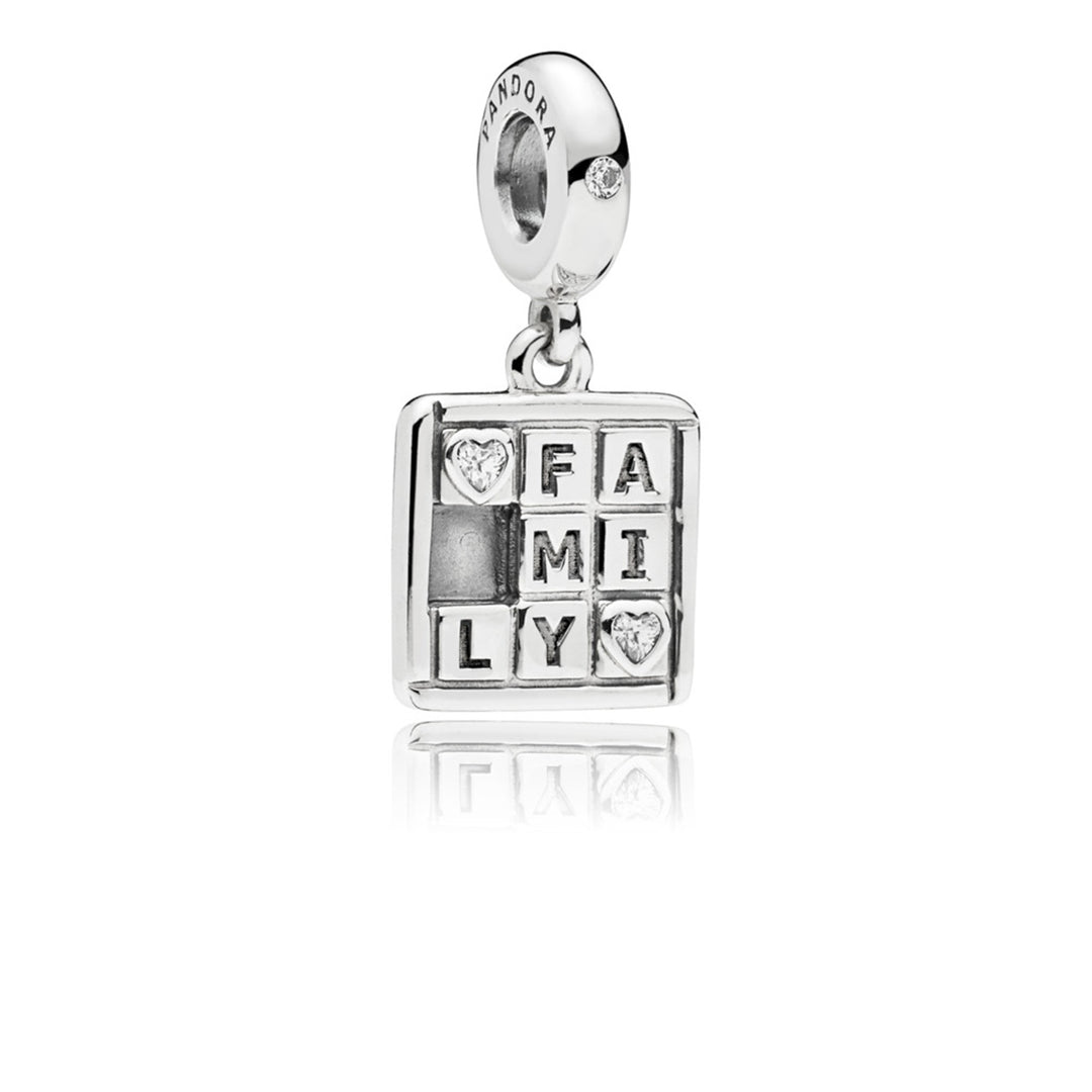 Family dangle in sterling silver with 2 bezel-set heart-shaped and 1 flush-set clear CZ and engraving "Family"