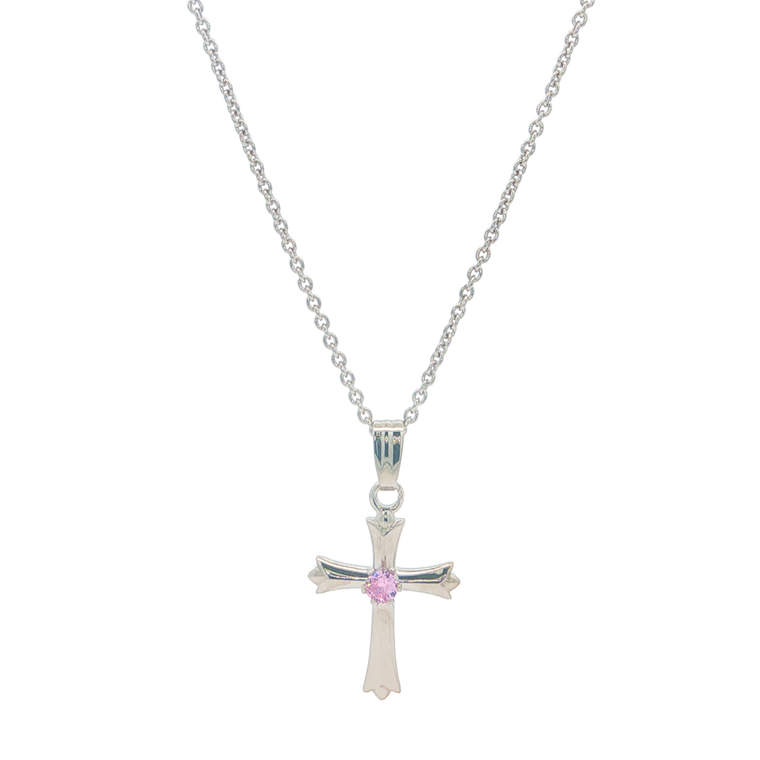 Sterling Silver Cross Pendant with Pink CZ on a 15" Chain