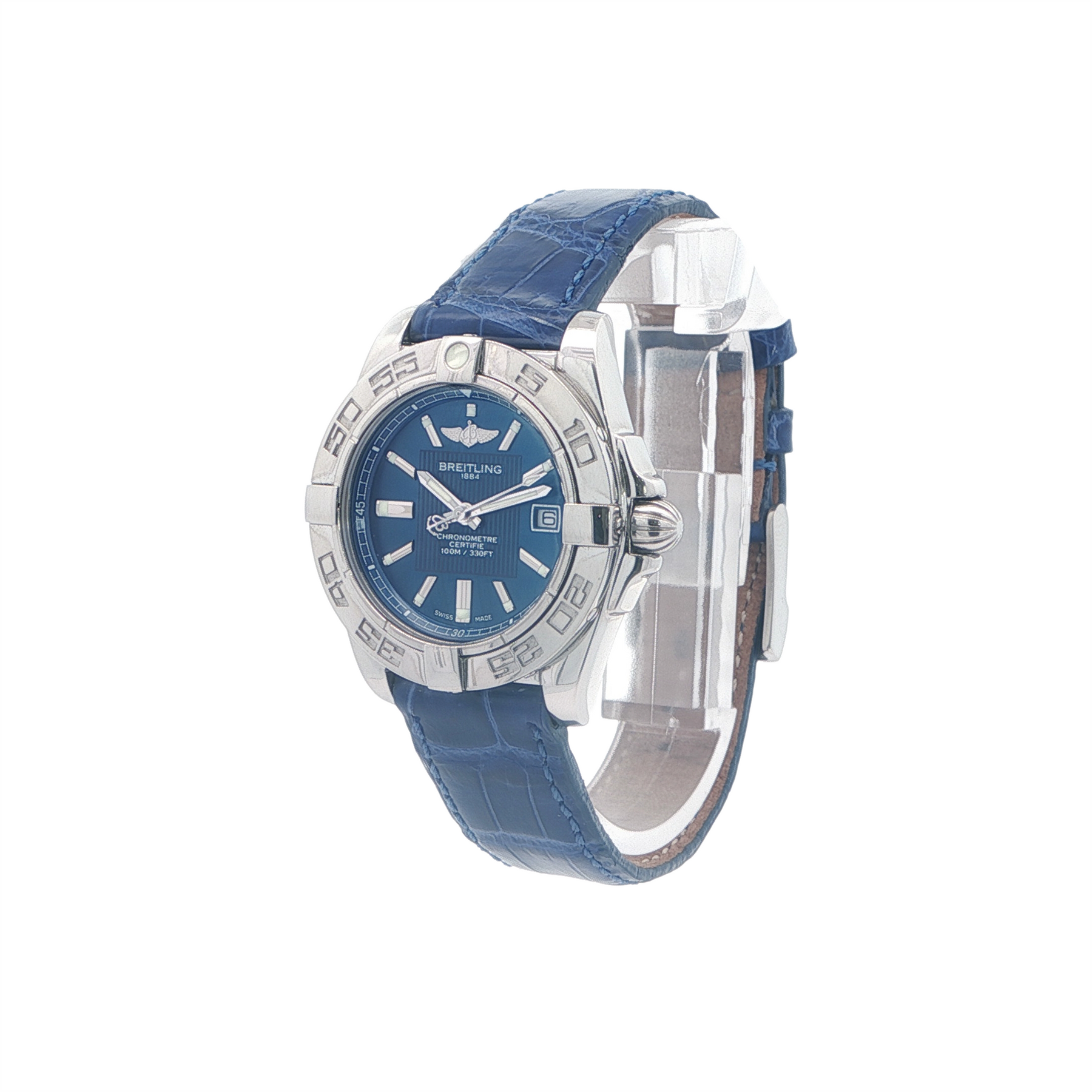 This Breitling Cockpit is a sophisticated timepiece that blends classic design with modern precision. This model features a deep blue dial paired with a matching blue alligator strap, creating a cohesive and striking look that stands out while remaining understated. Housed in a 32 mm stainless steel case, the watch offers a balanced presence on the wrist, perfect for both professional and casual settings. Powered by a reliable quartz movement, it ensures precision and ease of use, while Breitling’s renowned craftsmanship guarantees durability and long-term value. With its timeless styling, refined details, and harmonious color palette, this Cockpit is ideal for anyone seeking a versatile, elegant, and unmistakably Breitling watch.