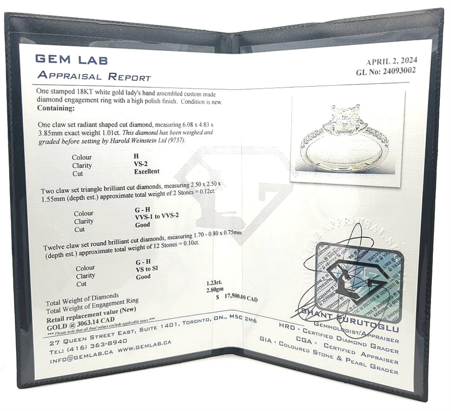 One claw set radiant shaped cut diamond, measuring 6.08 x 4.83 x 3.85mm exact weight 1.01ct. This diamond has been weighed and graded before setting by Harold Weinstein Ltd (9737).