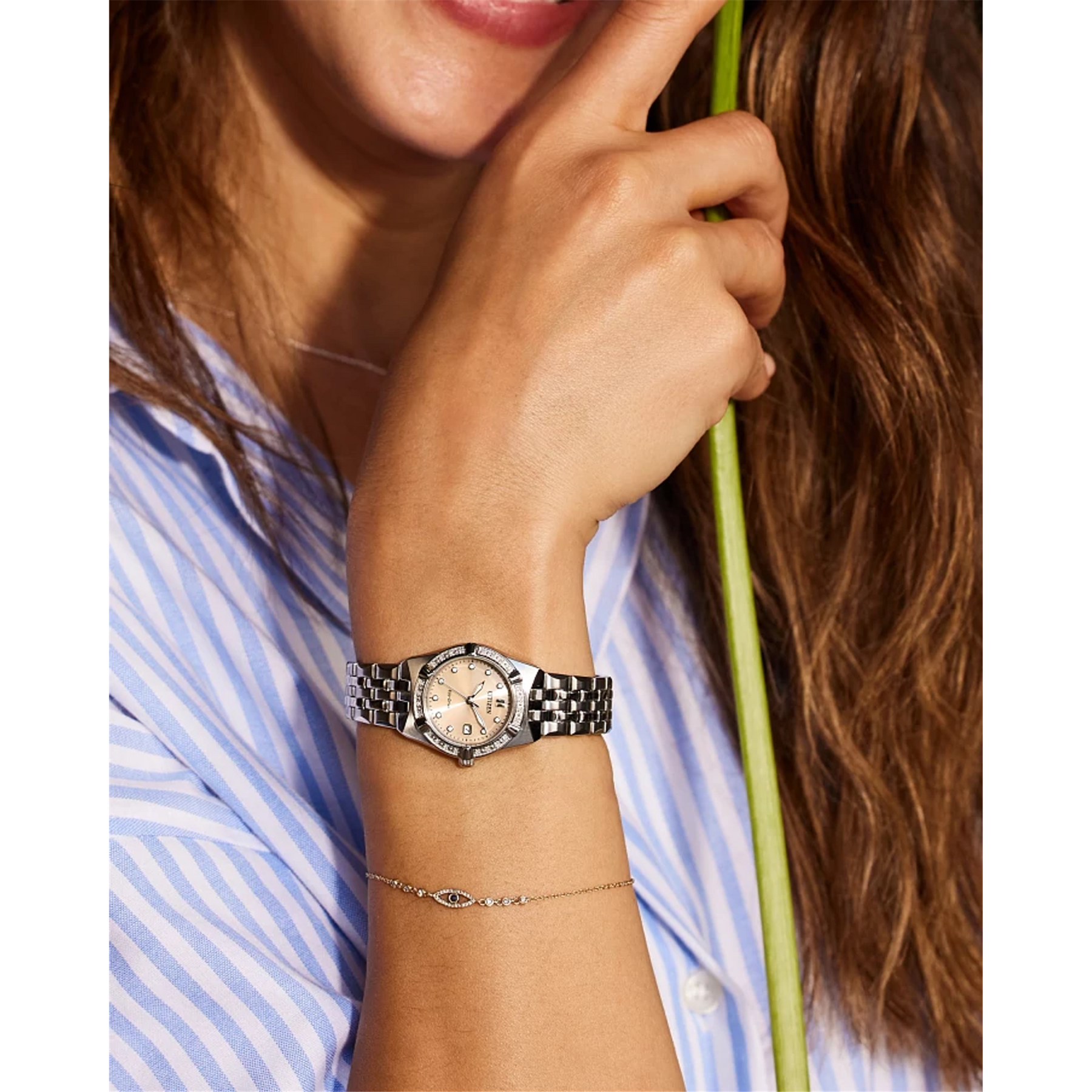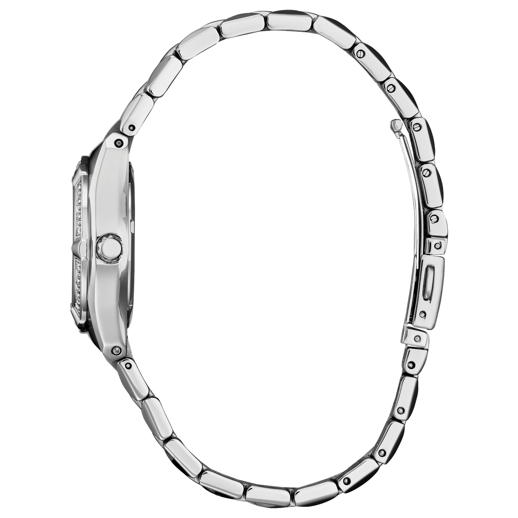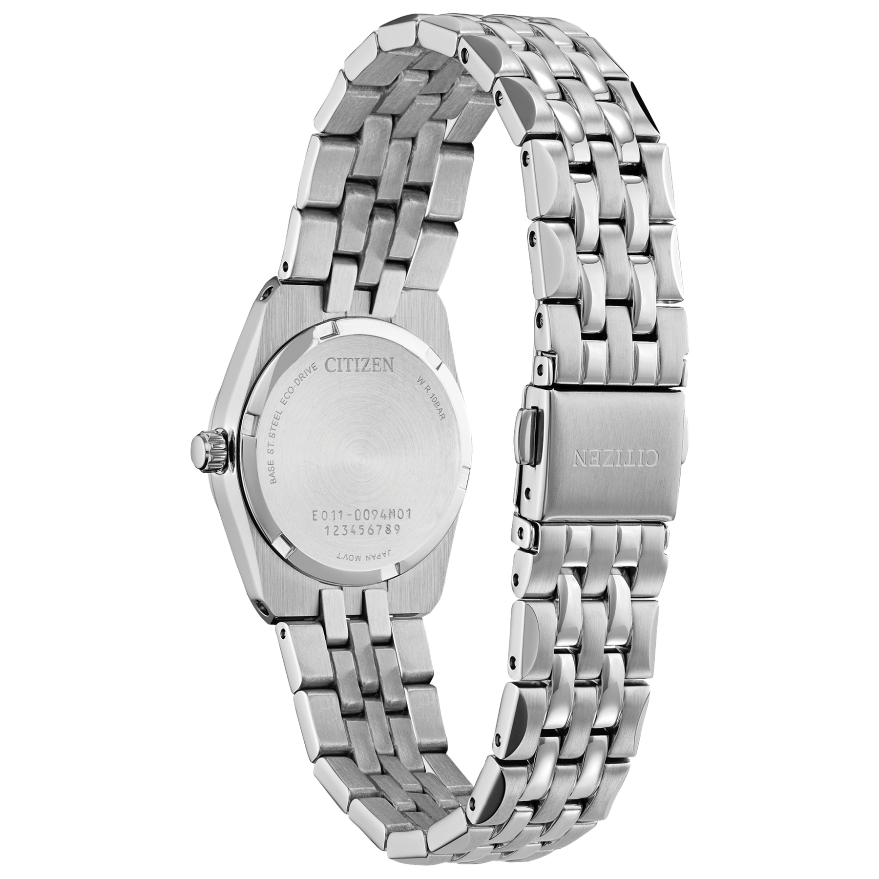 A classic timepiece is always in style in the Corso ladies' watch from Citizen, now with added touch of sparkle. Featuring a diamond-accented bezel on a silver-tone stainless steel bracelet and 28mm case and matching bracelet, and a 3-hand taupe dial and date indicator, luminous hands, and applied indices – this elegant timepiece also has a fold-over clasp closure with hidden push buttons and is water resistant to 100 metres. If you’re looking for a dress watch to add elevated, diamond-touched style to your wardrobe, look no further – the Corso is the perfect choice. It also uses Citizen’s Eco-Drive technology, so it is sustainably powered by any light and will never need a battery. Calibre E011.