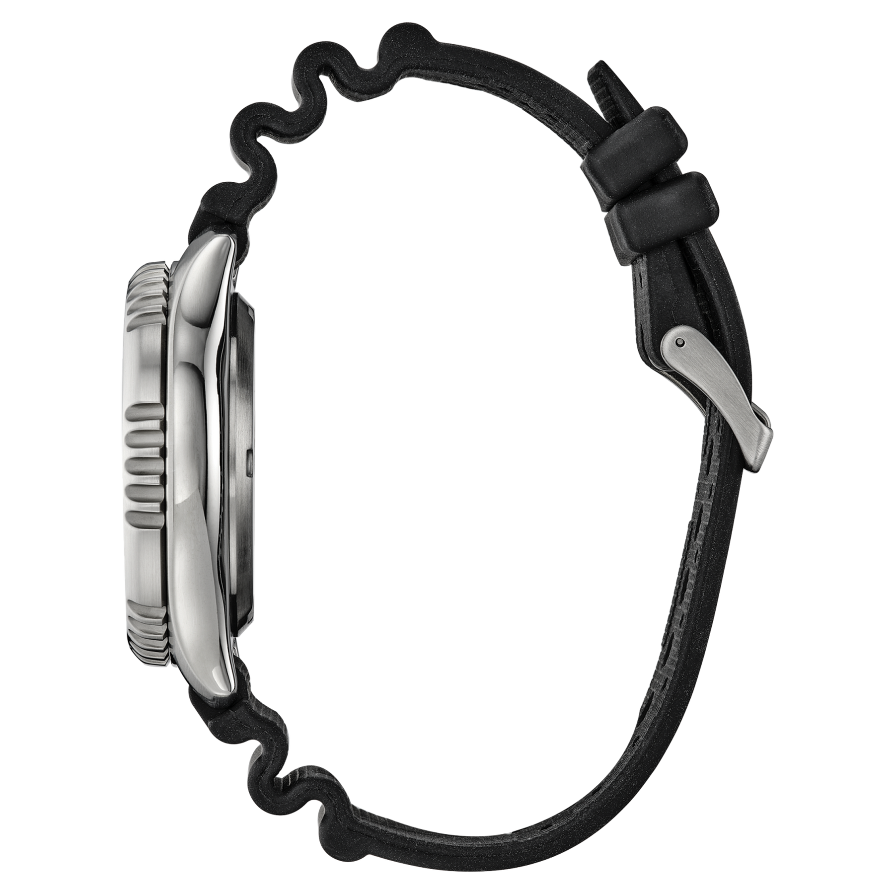 A classic never goes out of style. The newly reimagined Promaster Dive Automatic men’s watch by Citizen goes deeper into the history of the original version of this diving watch that was released in 1989 for the new generation of dive watch enthusiasts. A design element that stands out is the distinctive, serrated bezel design that was inspired by a “Fugu,” the Japanese name for pufferfish. Featuring a 3-piece, 44mm case, anti-reflective sapphire crystal, and durable black polyurethane strap, the black easy grip aluminum ring surrounds the black dial and luminous hands and markers, while the case back features an engraving of a fugu or pufferfish. This technically advanced and stylish men’s sport watch powered by the motion of your wrist comes in an exclusive collector’s dive tank box and is ISO compliant with a screw-down crown and water resistant to 200 metres. Calibre 8204.