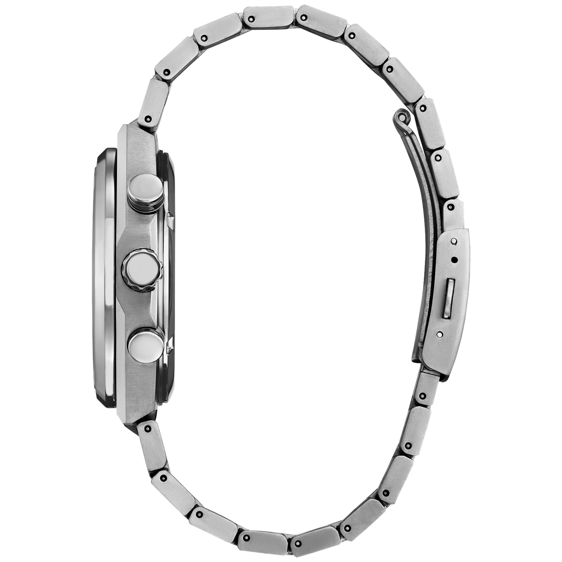 Pairing classic proportions with a distinctly modern style, meet the new Integrated Super Titanium™ series from Citizen. Featuring a 42.4mm silver-tone Super Titanium™ case paired with stylish stepped chronograph pushers and a stylized crown, the finely brushed and polished timepiece is secured to the wrist with a matching integrated bracelet. On the dial, a textured white-silver tone colour is accented with an outer tachymetric scale and triple register configuration in black, with details in silver-tone and white put to use for the handset and applied indices. Features include running time, a split-second chronograph, 12/24 hour time, and date. Sustainably powered by any light with Eco-Drive technology and never needs a battery. Water resistant to 100 metres. Calibre B620.