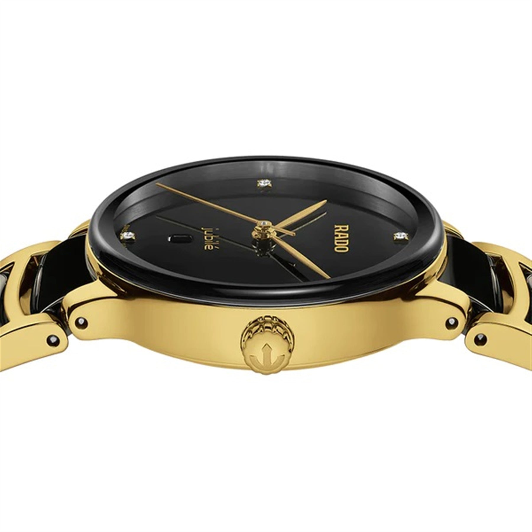 The classic Centrix Quartz Diamonds watch has been reworked not only technically, but also aesthetically. The modified model has a rounded sapphire crystal that extends all the way to the edge and a curved case blending with the curved crystal edge. The overall appearance of this iconic timepiece is completed with adjusted case lugs and a bracelet made of polished yellow gold-coloured PVD-coated stainless steel with black high-tech ceramic middle links. The black lacquered dial with 4 diamonds, emphasised with the printed “jubilé” logo, matches perfectly with the yellow gold-coloured hands. Thanks to the PreciDrive and HeavyDrive features in the calibre R079 quartz movement, the watch has greater accuracy and resistance to shocks. The watch is water-resistant down to 50 m.