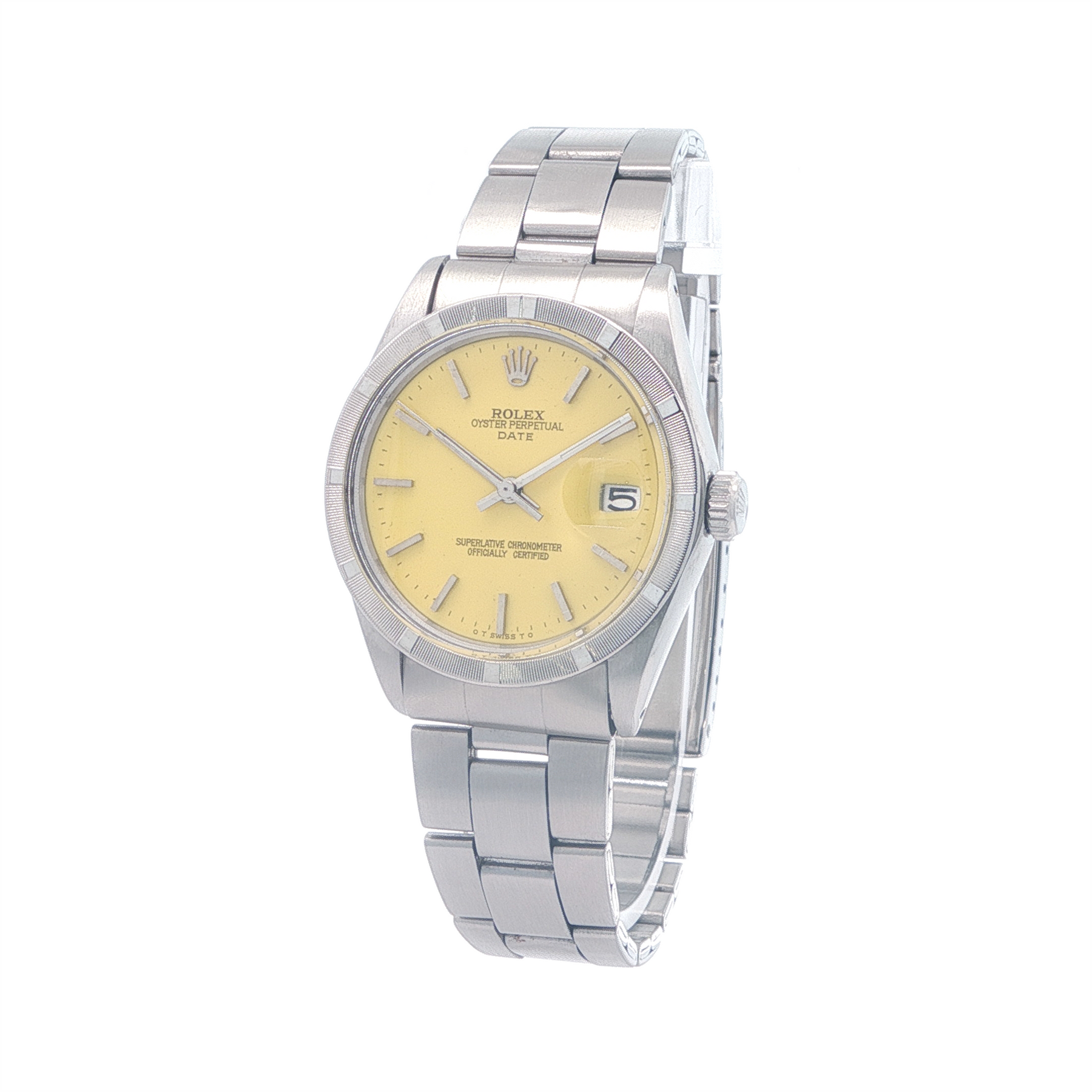 This Rolex Date from 1972 is what happens when classic Swiss seriousness decides to loosen its tie a little. Traditionally known for its clean lines and engine-turned bezel, this particular example shows up with a bright yellow custom dial that feels less boardroom and more sunshine on espresso. It’s still every bit the vintage Rolex—automatic, dependable, and built in an era when watches were made to quietly outlive their owners—but that dial adds just enough personality to make people look twice. Think of it as a perfectly tailored 1970s Armani suit… paired with a very loud pair of socks.