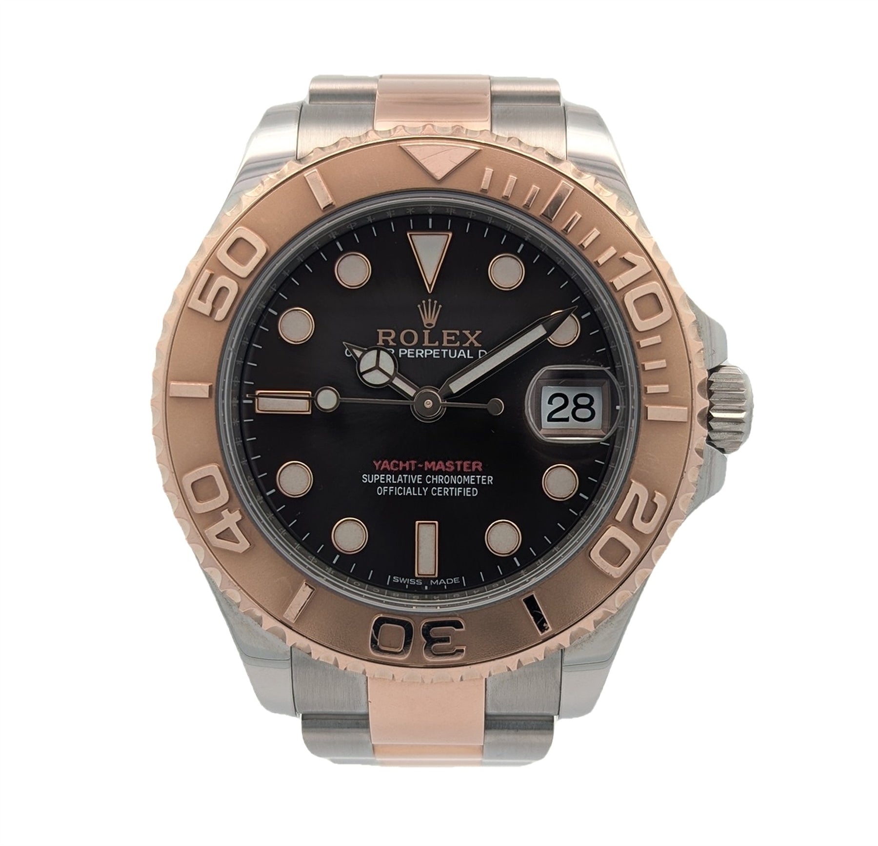 The distinctive bidirectional rotatable bezel with a 60-minute graduated insert in Everose adds a touch of sporty flair, emphasizing the Yacht-Master's maritime heritage. The chocolate brown dial, adorned with luminescent hour markers and hands, offers excellent legibility in any lighting condition.
