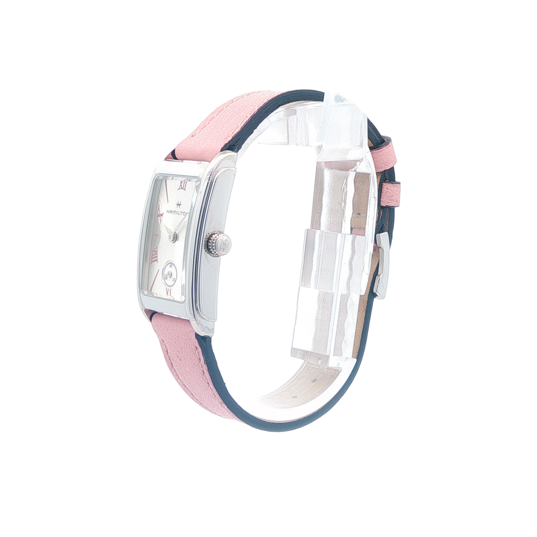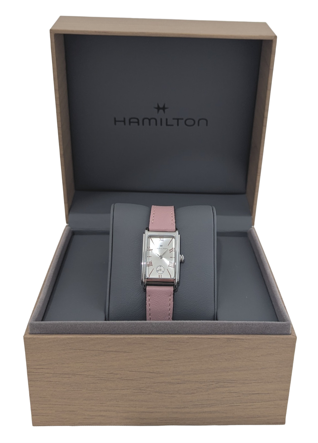 Charming, elegant, and playfully feminine, this Hamilton American Classic Ardmore brings a fresh twist to timeless Art Deco design. Its graceful rectangular case and clean dial are accented by crisp number markers for easy readability, while the soft pink strap adds a touch of personality and warmth. Perfectly sized for everyday wear, this Ardmore combines classic sophistication with a modern, stylish flair — a watch made to brighten every moment on the wrist.