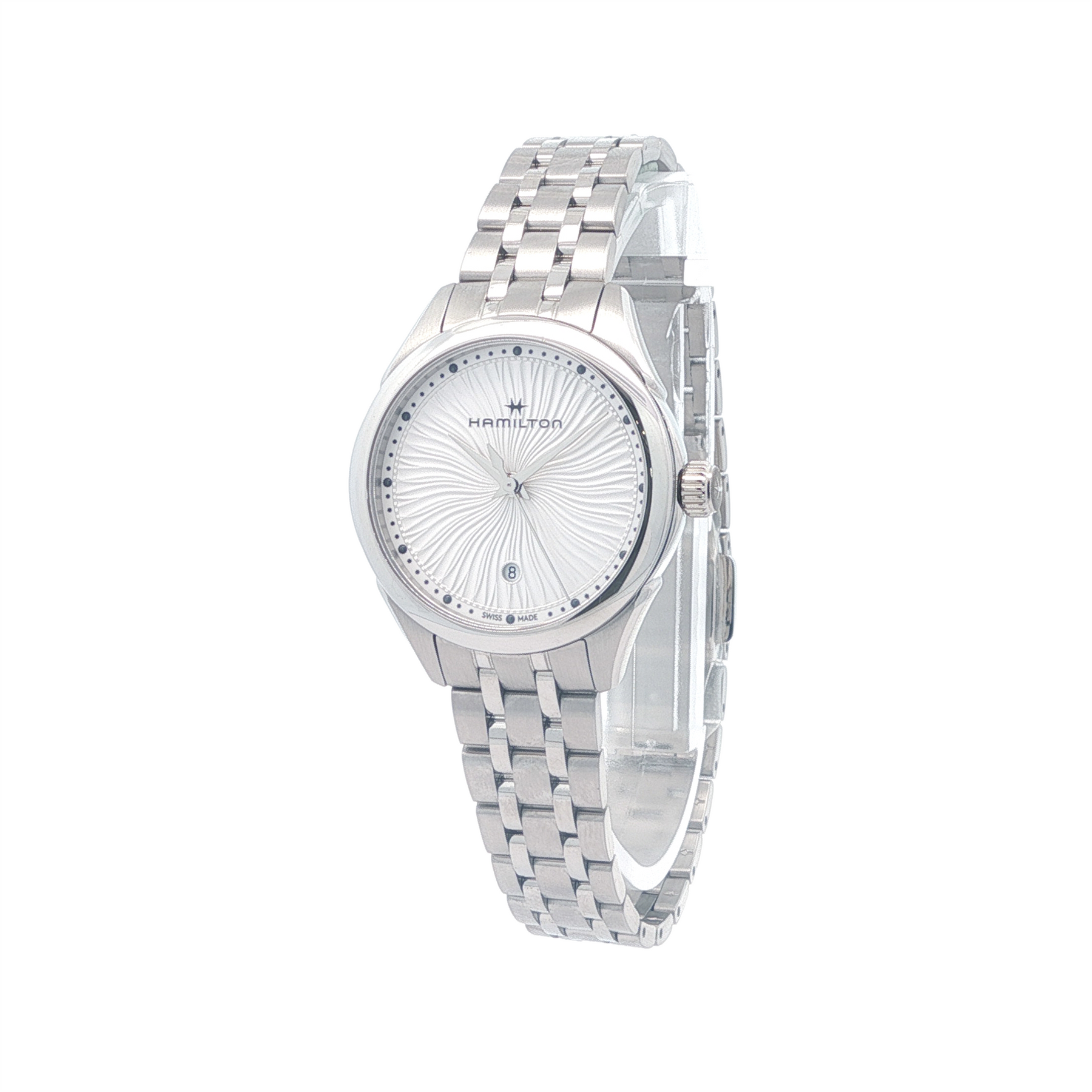 A timeless blend of classic design and Swiss precision, this Hamilton Jazzmaster offers sophisticated style with everyday versatility. Housed in a polished 40 mm stainless steel case with a clean, refined dial featuring crisp baton indices, a subtle date window, and slim hands under scratch‑resistant sapphire crystal, this watch delivers effortless elegance whether you’re in the office or out for the evening. Powered by a reliable Swiss automatic movement, it provides smooth timekeeping and dependable performance, while the comfortable stainless‑steel bracelet completes its upscale yet approachable look.