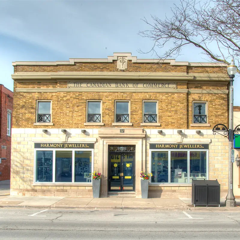 Harmony House Jewellers moved to their current Grimsby location at 37 Main St W. In 1876, this was the site of a blacksmith and woodworking shop, and in 1927 the Canadian Bank of Commerce built this fine building. In 1965, the name of the bank was changed to the Canadian Imperial Bank of Commerce.